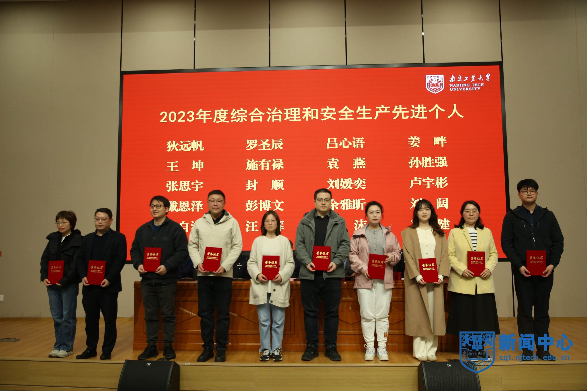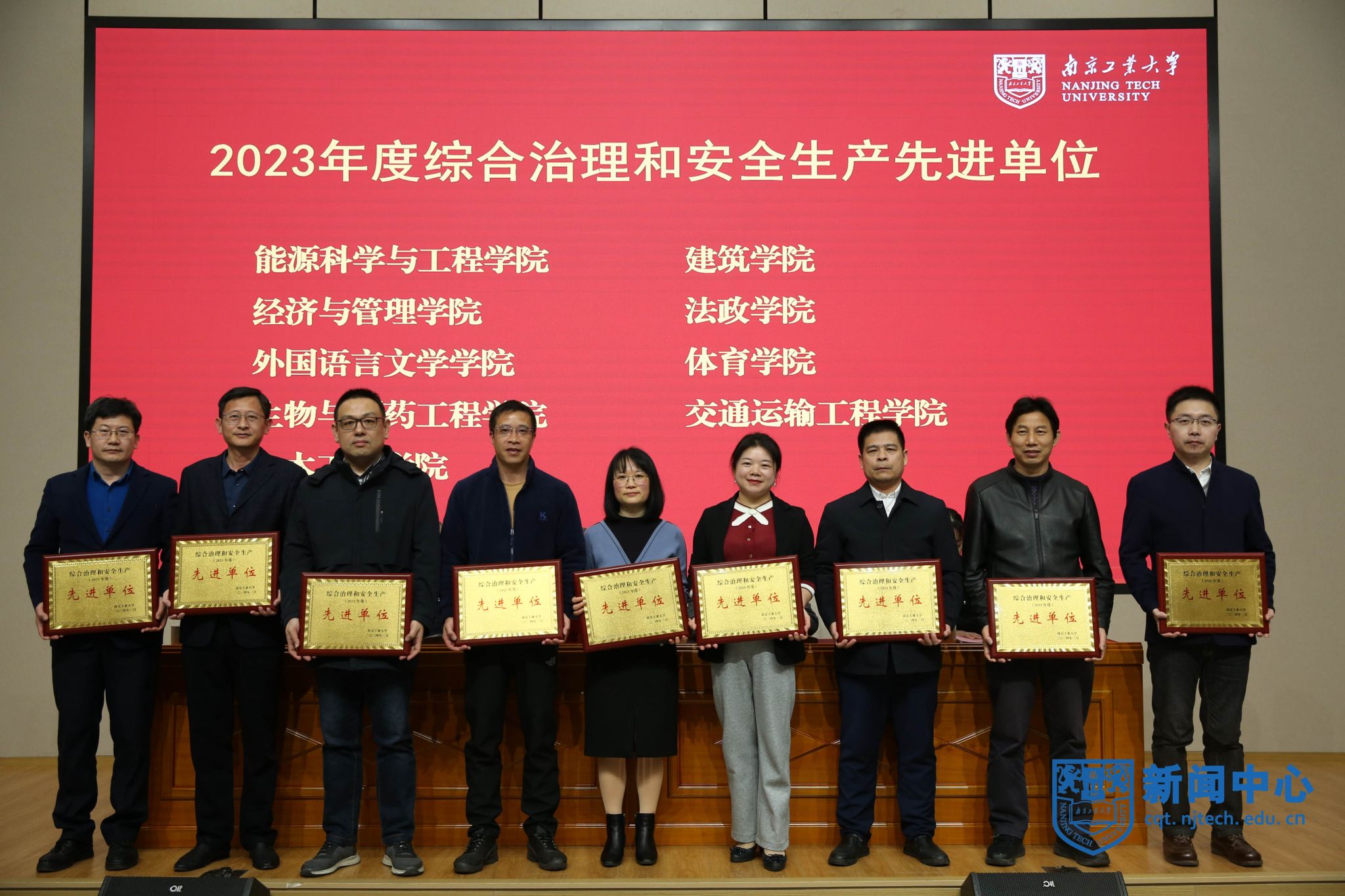 刘大卫宣读了2023年度校综合治理和安全生产先进单位及个人名单,主席台领导为获奖集体和个人代表颁奖。土木工程学院张涛、材料科学与工程学院卢都友、体育学院陈军、生物与制药工程学院庄伟、计算机与信息工程学院高路先后作交流发言。刘大卫代表学校与四家二级单位主要负责人现场签订了《综合治理和安全生产责任书》。