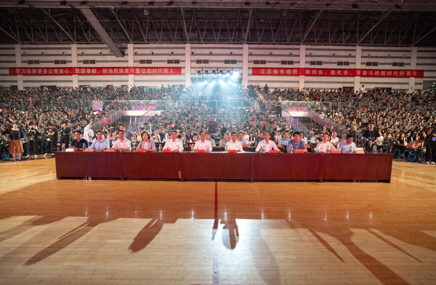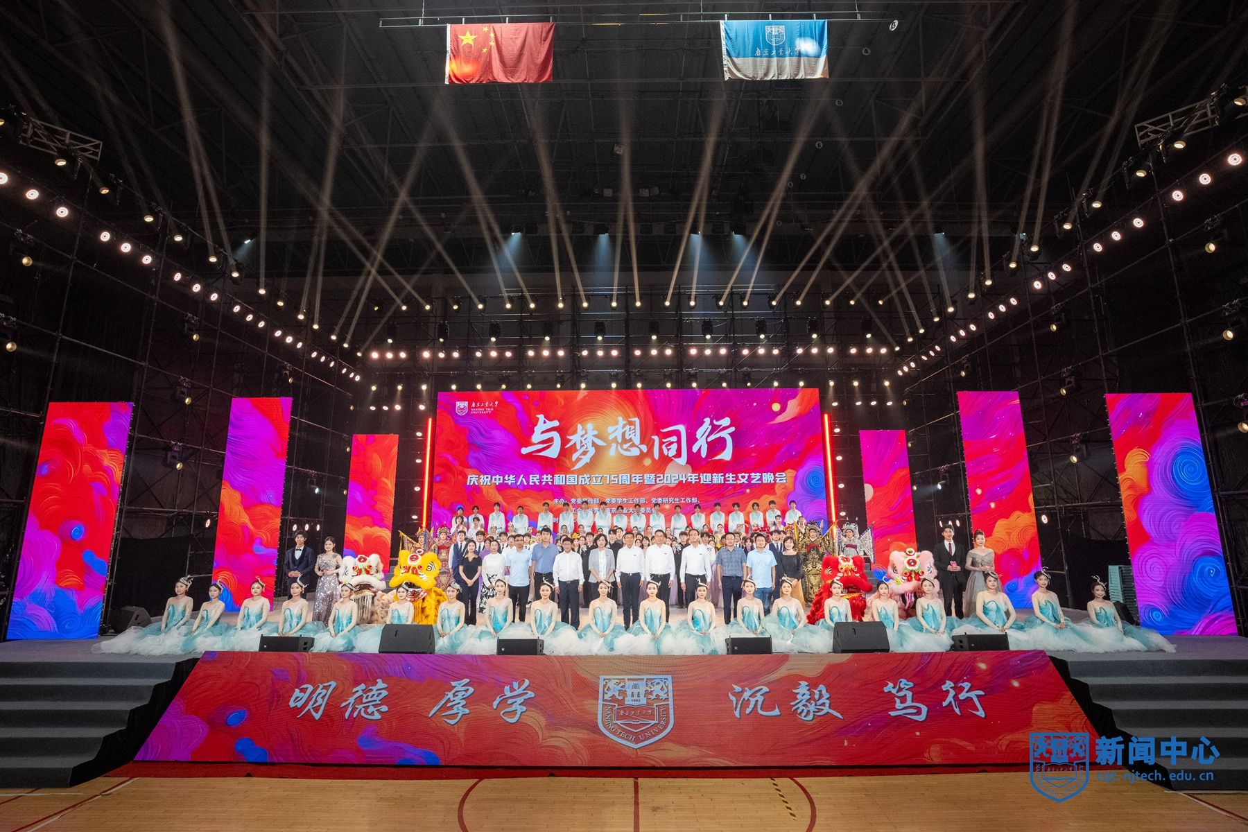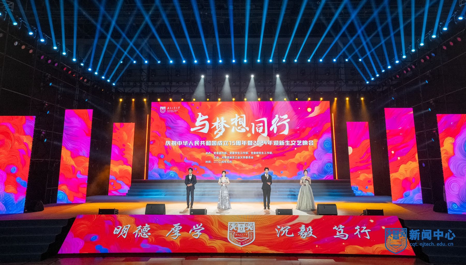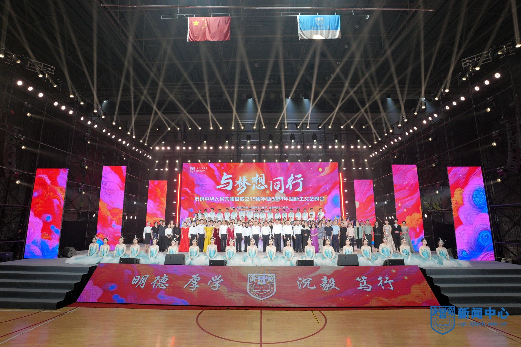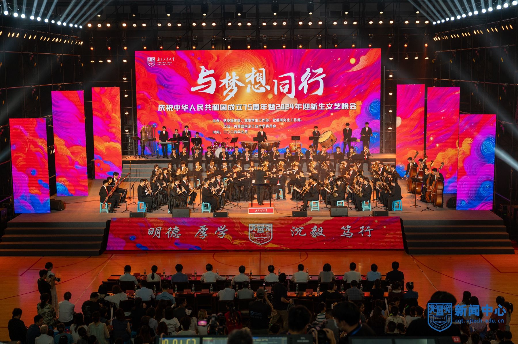 9月28日、29日晚,“与梦想同行”庆祝中华人民共和国成立75周年暨2024年迎新生文艺晚会在江浦校区行健体育馆举行。校领导芮鸿岩、蒋军成、吴胜红、王敦宝、陆伟东、郭万牛、刘大卫、戴志晖,新生军训旅旅长康凯中校、副旅长王世界少校出席活动。2024级本科生、研究生以及留学生代表现场观看演出。