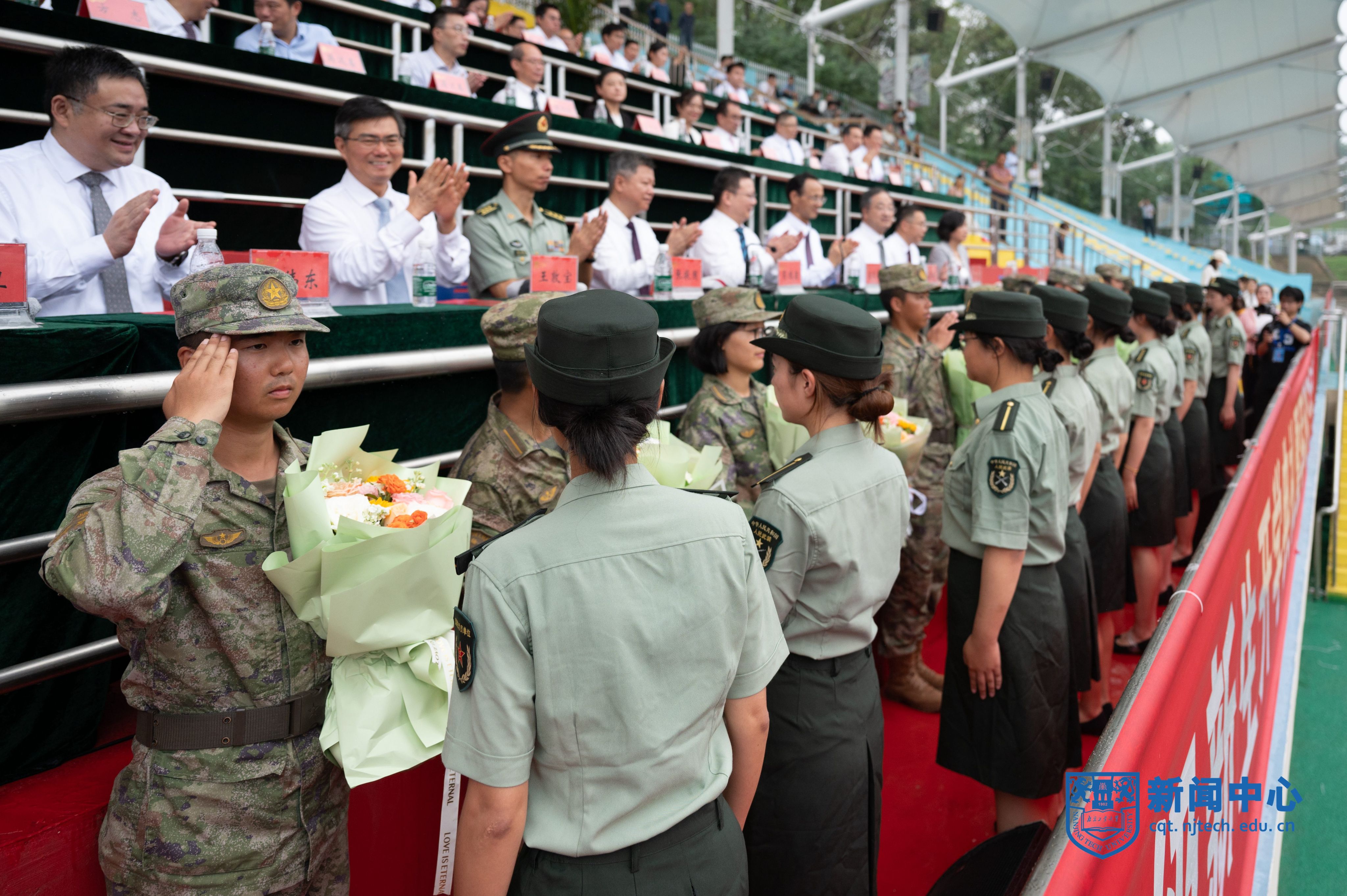 上午八点半,在升国旗仪式后,军训汇报考核正式开始。新生们通过队形的变化和道具呈现了“请党放心 强国有我” “明德 厚学 沉毅 笃行”等字样,表达了迎接新中国成立75周年的喜悦之情。在分列式展示中,新生们组成若干方阵,精神饱满、队列整齐地通过主席台,充分展示了青春激扬的风采。随后分别进行了捕俘拳、匕首操、棍盾术、刺杀操、战术等展示。汇报考核结束后,主席台前排领导和嘉宾为军训先进集体和先进个人代表颁奖。学生代表向承训教官代表献花,蒋军成向承训部队赠送锦旗。期间,举行了退伍大学生光荣返校仪式。