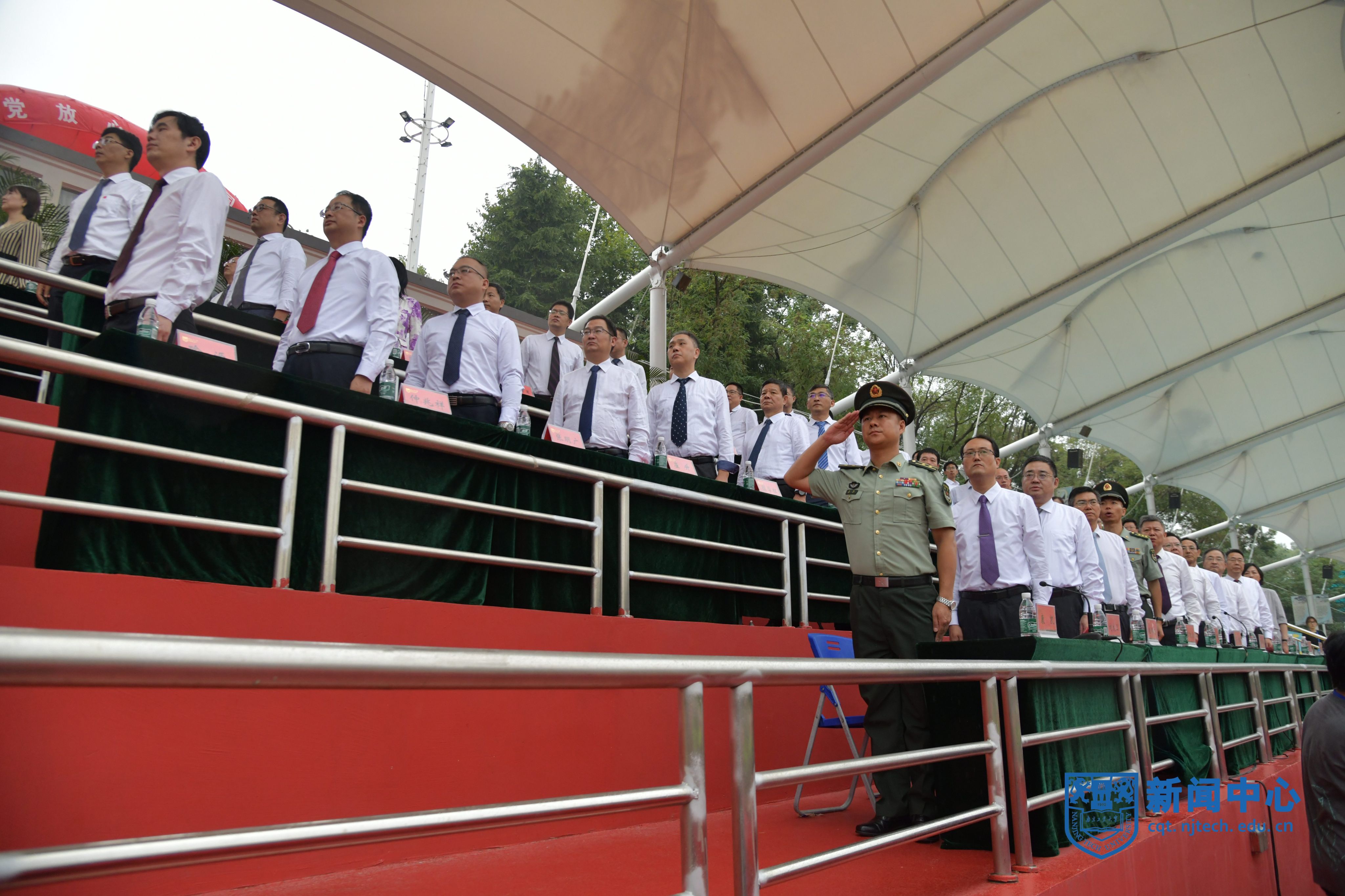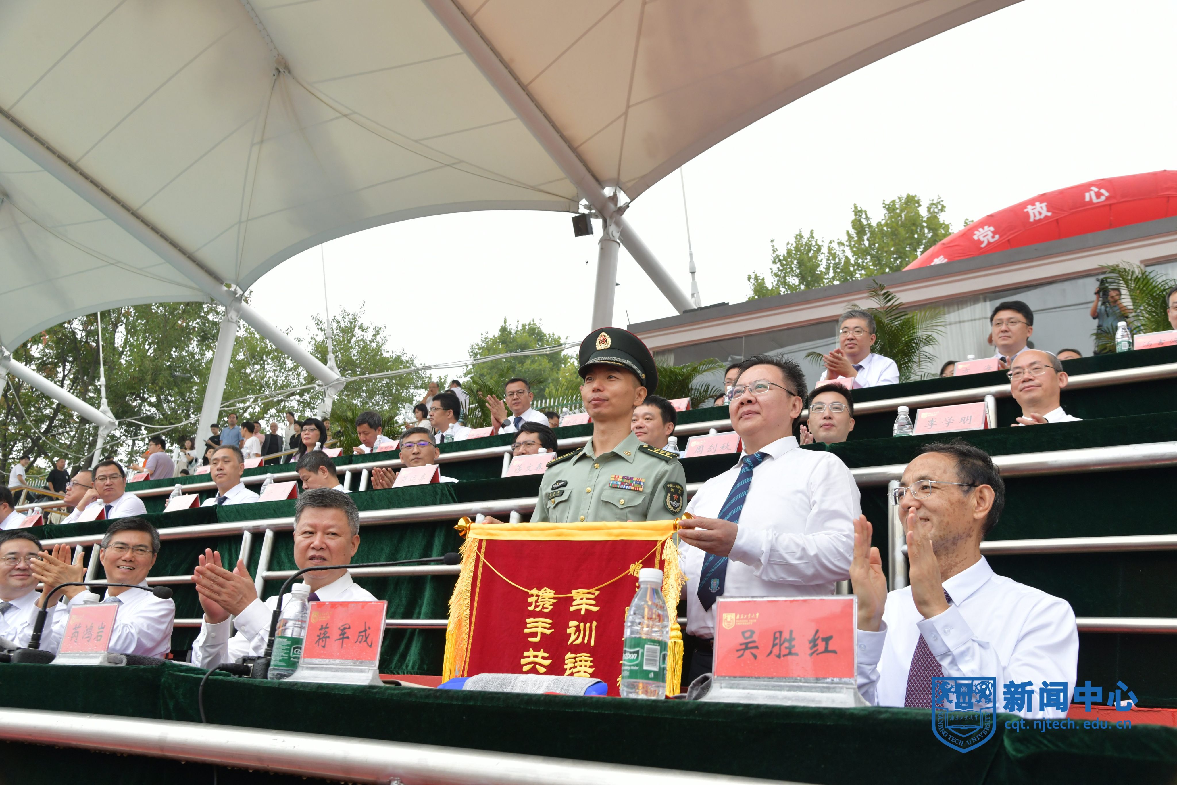 陆军工程大学指挥控制工程学院学员十大队政治委员张振国上校,陆军工程大学指挥控制工程学院学员十大队副大队长康凯中校,校领导芮鸿岩、蒋军成、吴胜红、王敦宝、凌祥、陆伟东、郭万牛、戴志晖,相关职能部门、各学院主要负责人等在主席台就座。副校长刘大卫主持开学典礼暨军训汇报考核。