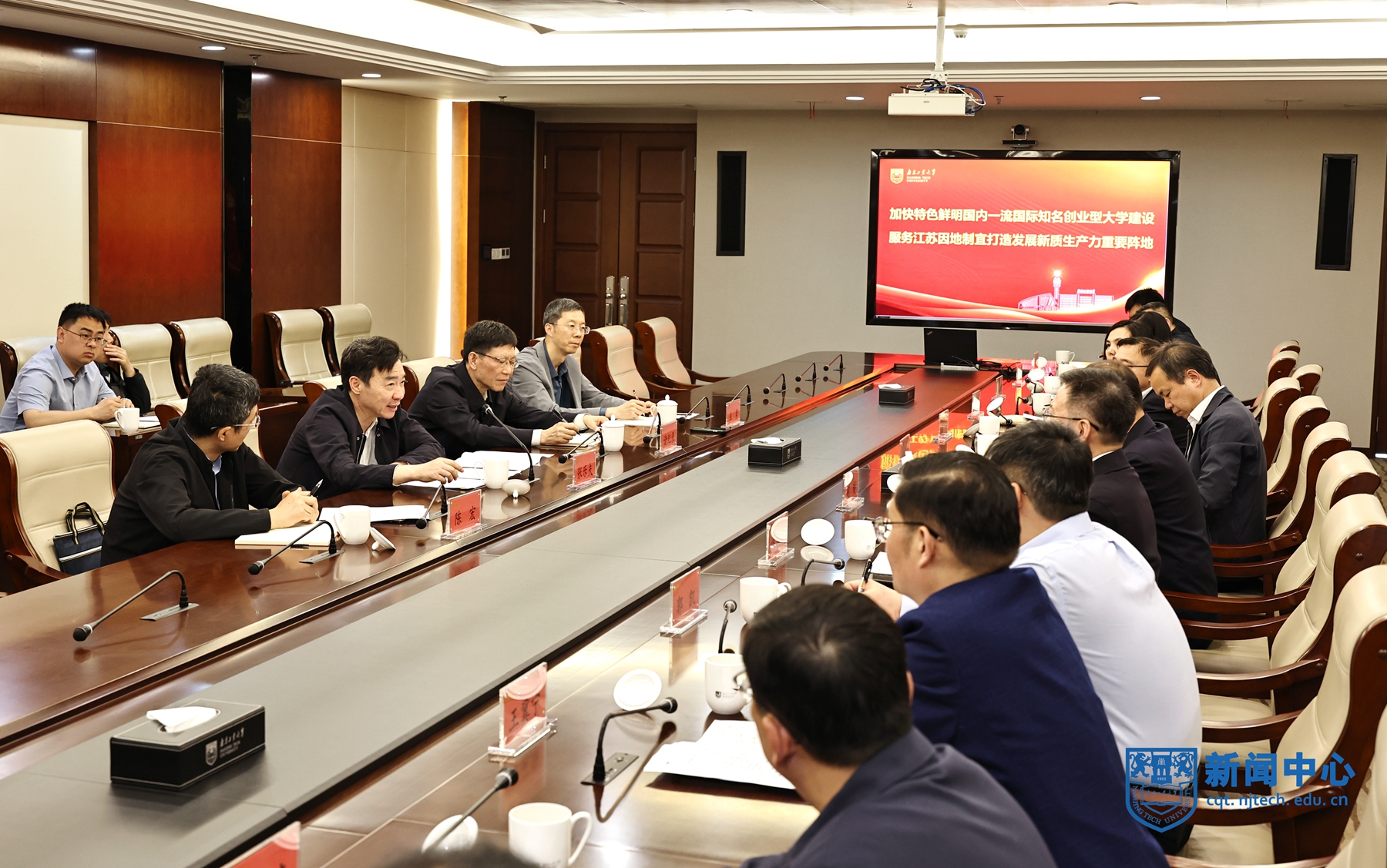 校长蒋军成介绍了学校在推动科技创新和成果转化方面的做法成效。他指出,学校秉持“顶天立地”理念,对接江苏产业地图和行业发展地图,深化大平台、大团队、大项目、大成果“四轮驱动”,全方位提升服务江苏高质量发展能力。他围绕科技成果转化中的堵点卡点问题进行分析,并对如何更好推动科技创新、转化应用提出举措。