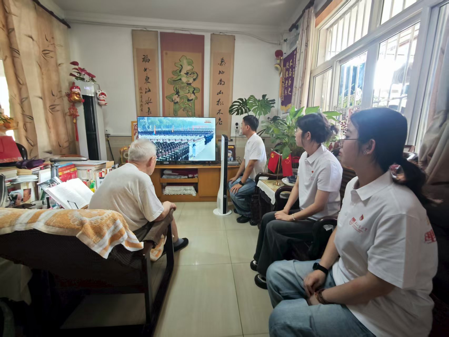 中国工程院院士徐南平、先进轻质高性能材料研究中心主任刘庆、外籍专家郝睿德等受邀参加了此次大会,现场观礼,感受中华民族从站起来、富起来到强起来的伟大飞跃。全体在校校领导在明正楼604会议室集中观看,各单位各部门结合实际,组织师生通过集中观看、自行观看、课后观看回放视频等方式观看。党委宣传部、党委研究生工作部组织“红色研语”理论宣讲团成员看望抗战老兵李剑锋,共同观看盛大阅兵式,感悟伟大抗战精神。