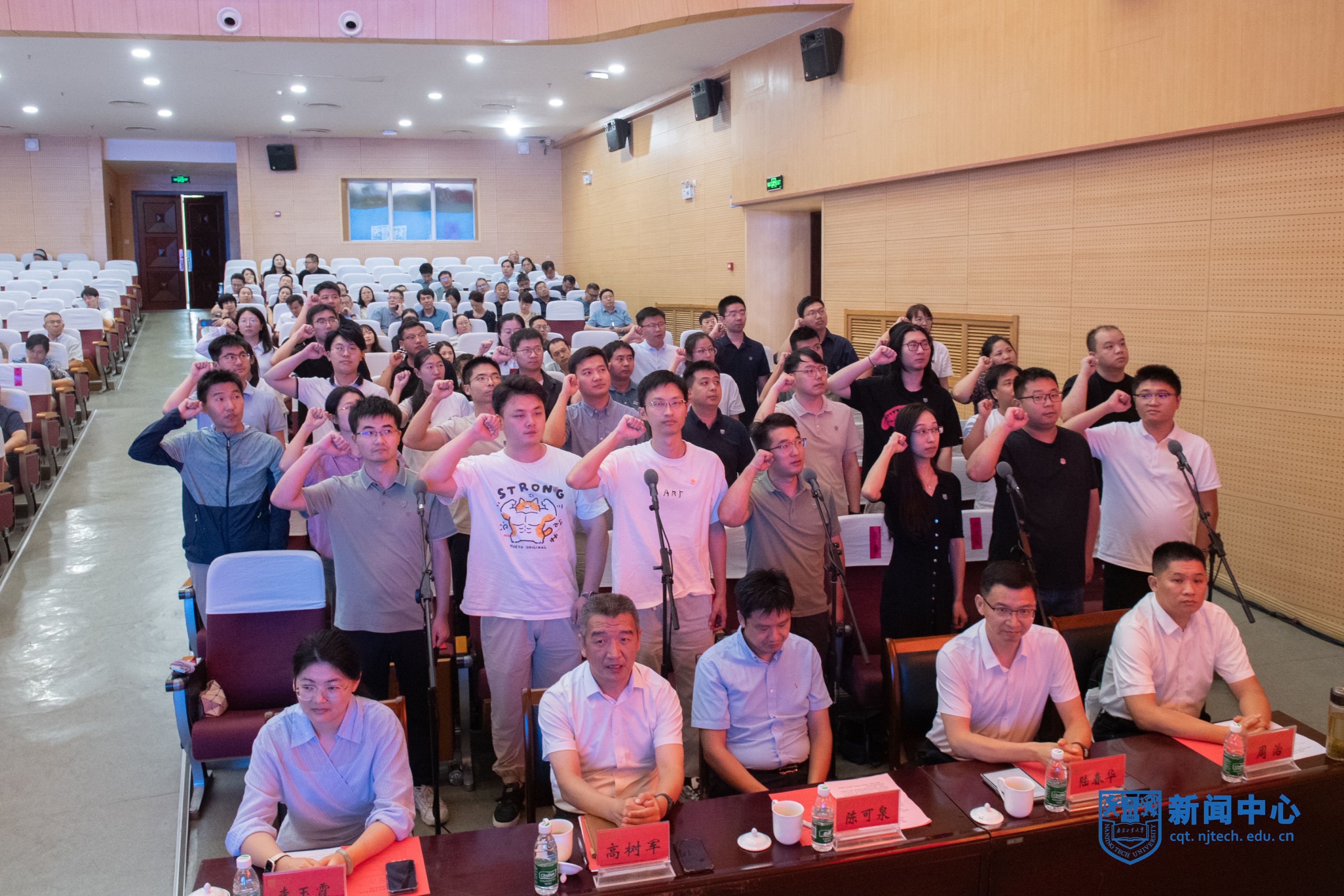 新进教师代表在全国三八红旗手、食品与轻工学院院长胡永红的带领下进行了庄严的入职宣誓。化工学院教授李玉霞、材料科学与工程学院党委书记高树军、生物与制药工程学院院长陈可泉、教务处处长陆春华、大学科技园管理办公室(技术转移中心)主任周治分别作交流发言。