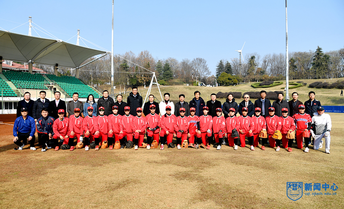 揭牌仪式结束后,领导和嘉宾一同前往体育学院综合楼参观交流并合影留念。随后,前往垒球场看望AC米兰江苏女垒队员。