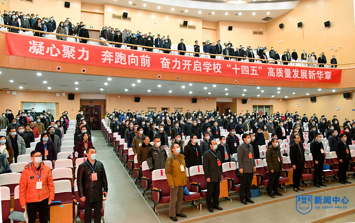 校长乔旭作题为《凝心聚力 奔跑向前——奋力开启学校“十四五”高质量发展新华章》年度工作报告。他对学校“十三五”期间工作进行了客观全面、实事求是的回顾,并从人才培养、学科建设、科学研究、人才引育、国际合作、学校治理六个方面对学校新的发展目标和工作任务作了详细部署,希望全体教职工提高政治站位、强化责任担当,瞄准目标,跑步前进,汇聚发展加速度,开启发展新局面。