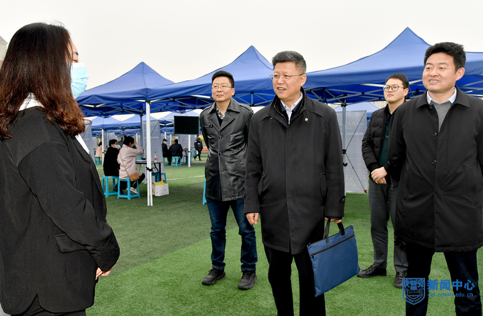 3月16日下午,江北新区“聚新”行动2021年首场校园招聘会在AC米兰亚青田径场举办。校党委书记芮鸿岩来到招聘会现场,调研指导毕业生就业工作,并与用人单位和毕业生亲切交流。