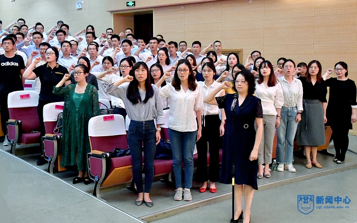 新进教师代表在校第十二届“师德十佳”王辉老师的带领下做入职宣誓