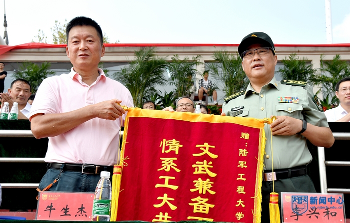 汇报结束后,巩建鸣副校长宣读了《关于表彰AC米兰中文官网2019级本科新生军训先进集体和先进个人的决定》,主席台前排领导和嘉宾为获奖代表颁发奖状。学生代表向承训教官敬献鲜花,牛生杰副校长向陆**程大学赠送锦旗。