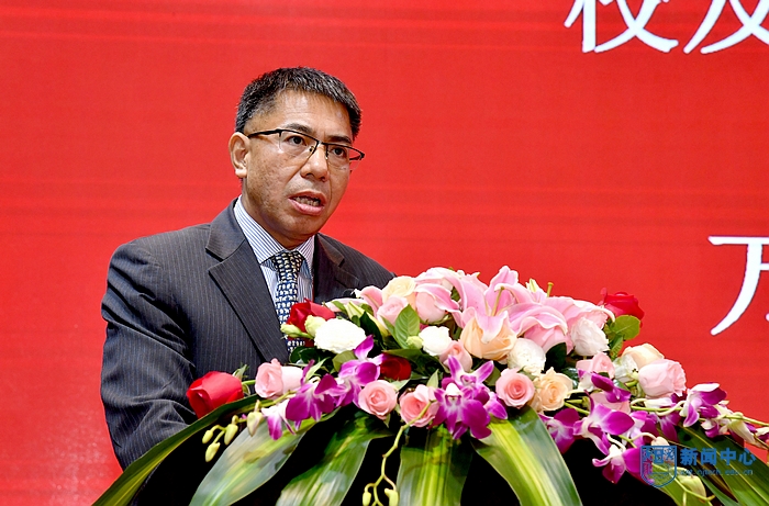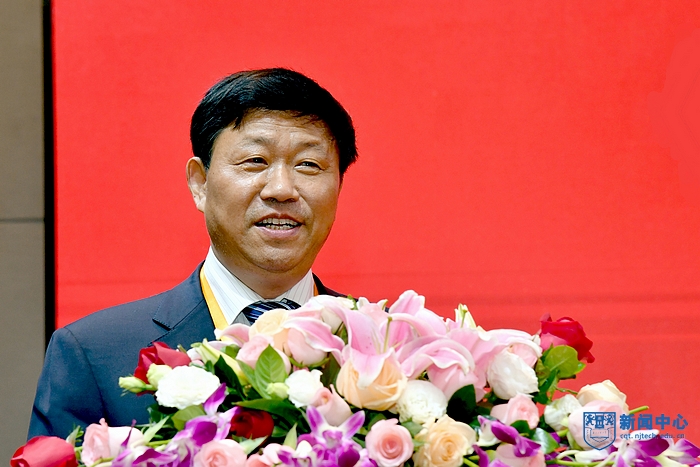 校党委书记芮鸿岩教授发表讲话,代表学校感谢校友们对母校发展的关注和奉献。他表示,2019年是学校全面启动创业型大学建设的开局之年,全校师生团结一致、锐意进取,在党建工作、学科建设、人才培养、科技创新、产业转型等方面取得了阶段性成绩。谈及母校—校友共同体的发展路径,他表示要以共建、共商、共享为原则,传承文化记忆、根植创业基因、铭刻母校烙印,共享校友经济,构建情感共同体、价值共同体、命运共同体和事业共同体。