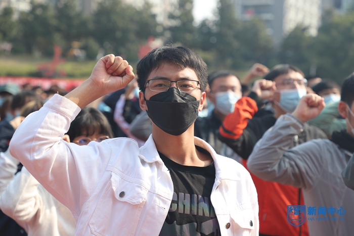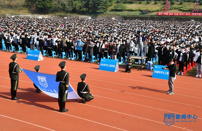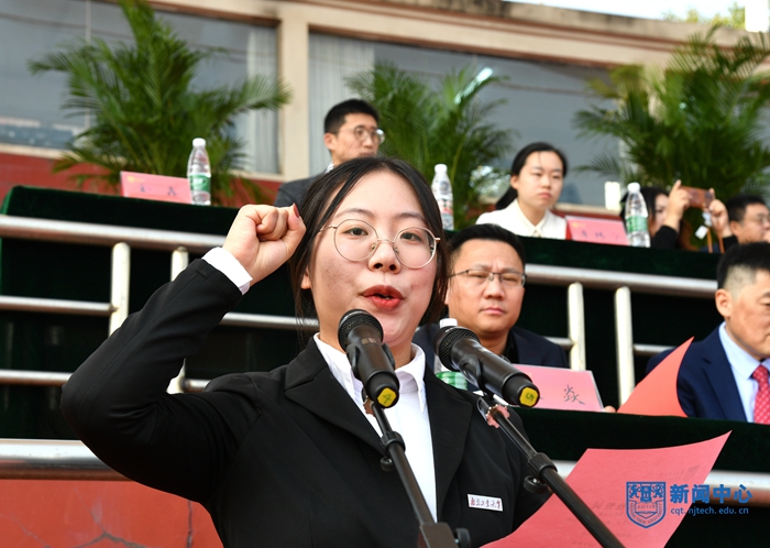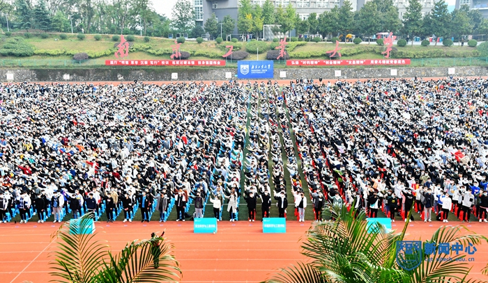 开学典礼正式开始前,全体师生合唱《没有共产党就没有新中国》《我和我的祖国》,全场新生齐诵:“今天,我们坚定前进的方向,为中华民族伟大复兴的中国梦贡献青春力量,请党放心,强国有我!请党放心,强国有我!”