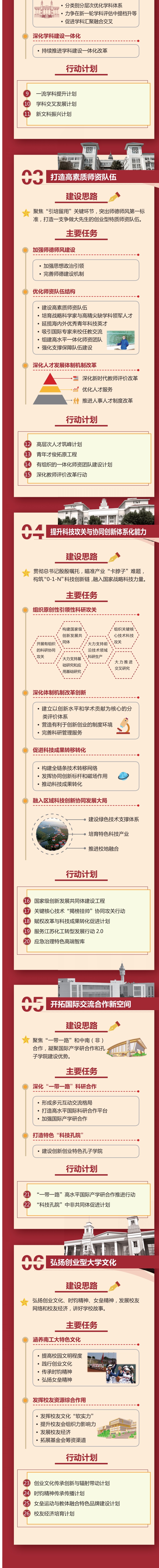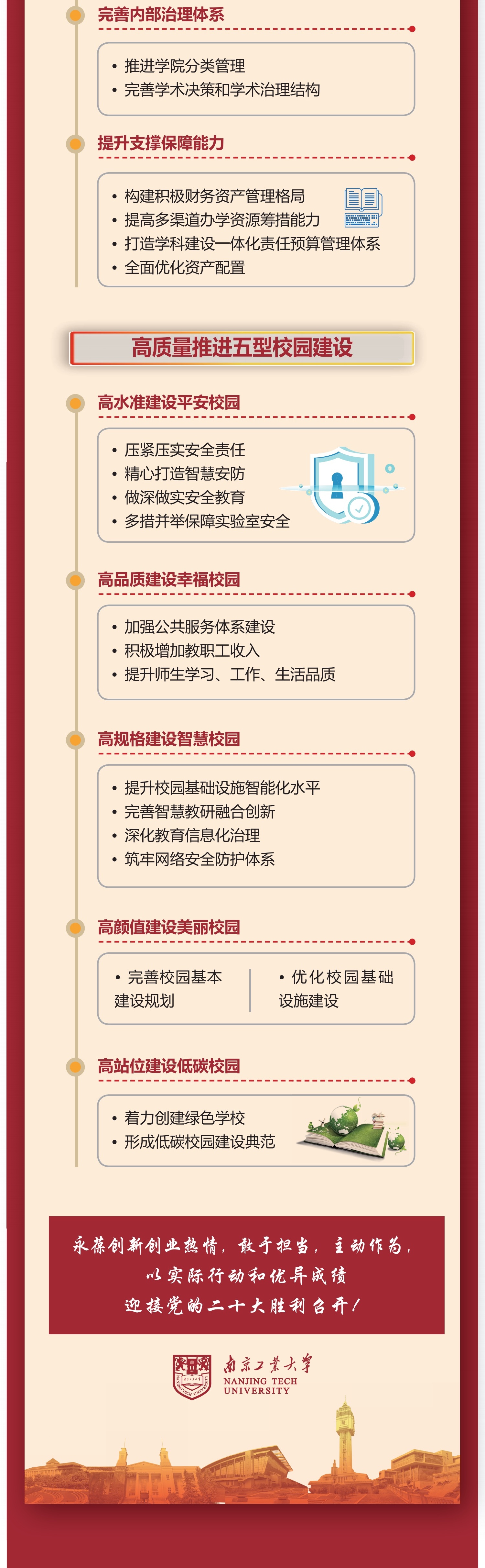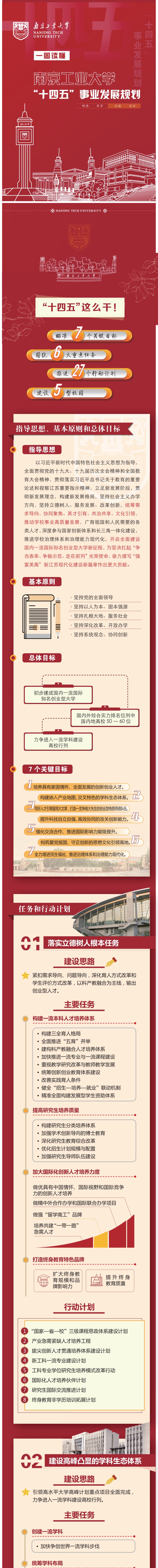 《规划》总计3.6万字,分为发展环境、主要目标、主要任务、保障支撑、组织实施五个部分,是学校“十四五”发展规划体系的统领。《规划》确立了初步建成国内一流国际知名创业型大学的“十四五”发展目标和70余项主要指标。《规划》提出,重点推进落实立德树人根本任务、建设高峰凸显的学科生态体系、打造高素质师资队伍、提升科技攻关与协同创新体系化能力、开拓国际交流合作新空间、弘扬创业型大学文化等六大重点任务,坚持与江苏省高水平大学建设高峰计划联动,重点实施27个行动计划。《规划》明确,全面加强党的领导,推进治理体系和治理能力现代化,高质量推进平安校园、幸福校园、智慧校园、美丽校园、低碳校园等五型校园建设。