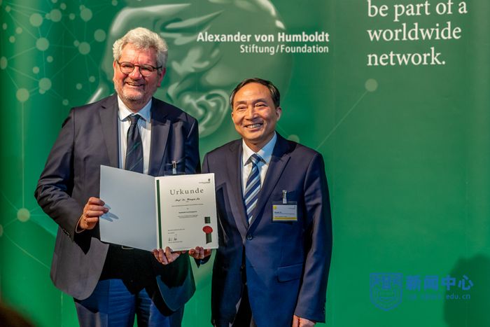 3月24日,金万勤教授参加了在德国班贝格(Bamberg)举行的德国亚历山大·冯·洪堡基金会“洪堡研究奖(Humboldt Research Award)”颁奖典礼,亚历山大·冯·洪堡基金会现任主席Robert Schloegl教授给他颁发了2021年度洪堡研究奖证书, 以表彰其“在国际膜科学与技术领域取得的杰出成就;他为新型分离膜的研究做出了重要贡献;他的研究将材料科学和工程方法与化学工程前沿相结合(Professor Jin is well known internationally for his outstanding research in membrane science and technology. He has made important contributions to the fabrication of novel synthetic membranes. His work combines methods of materials science and engineering with cutting-edge chemical engineering.)”金万勤教授是中国化学工程领域获得这一荣誉的第一人。