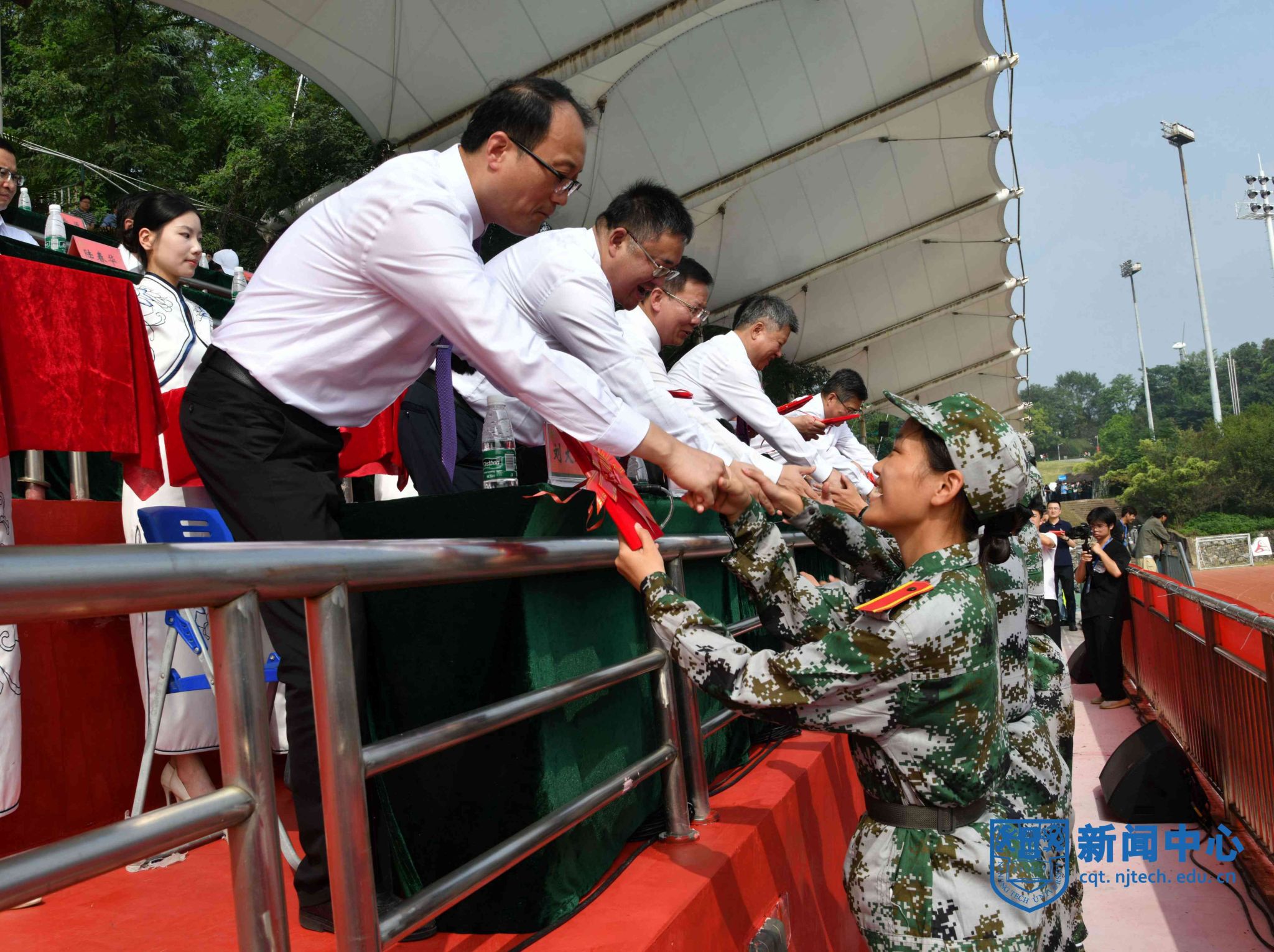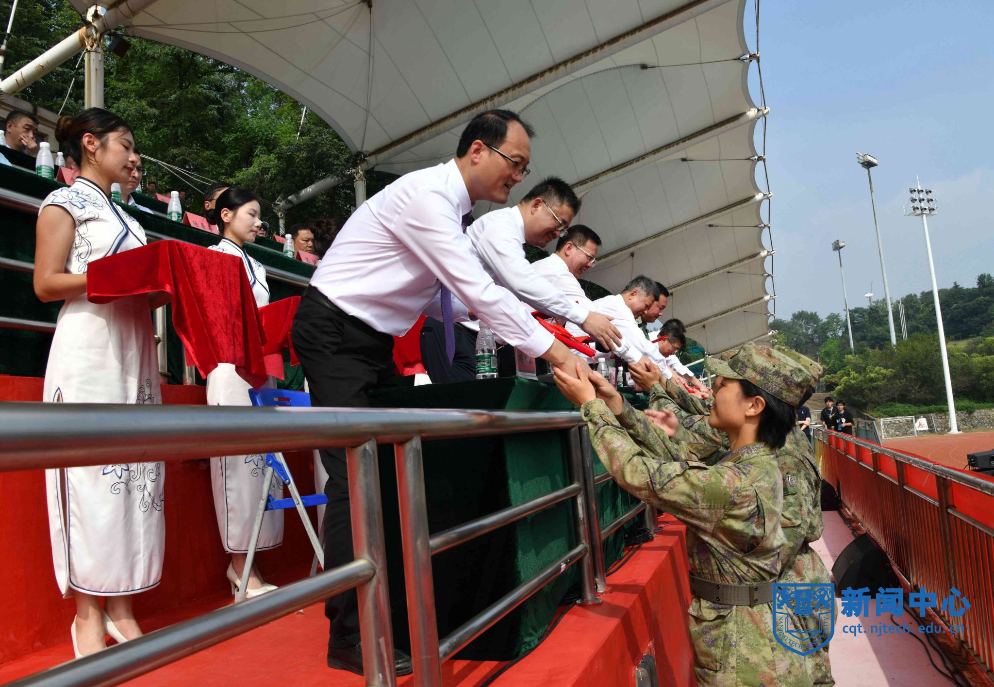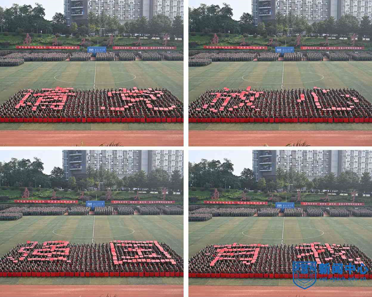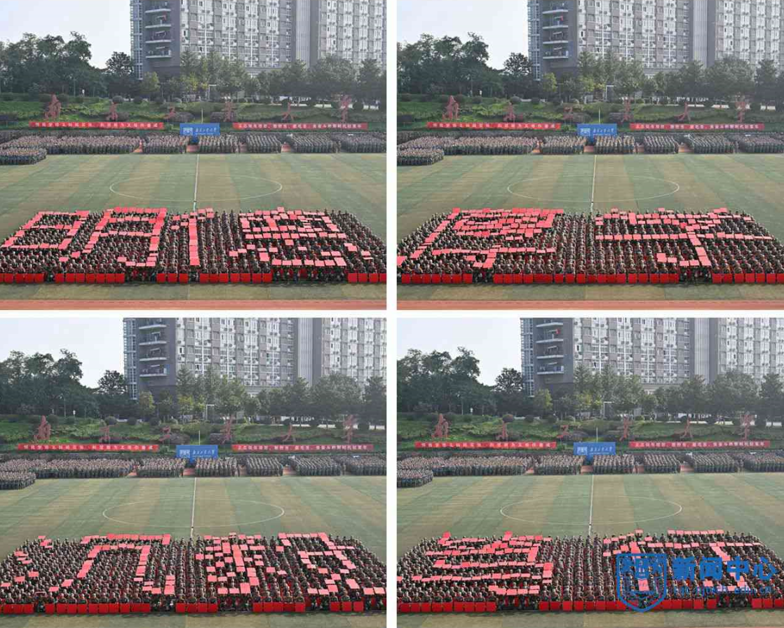上午八时三十分,在升国旗仪式后,军训汇报表演正式开始。芮鸿岩为退伍大学生代表佩戴光荣返校绶带。在进行的分列式表演中,2023级本科新生组成十个方阵,精神饱满、队列整齐地通过主席台,充分展示了青春激扬的风采。随后,2023级新生们分别进行了打鼓舞旗、舞蹈、军体拳、盾棍术、匕首操、战术、刺杀操等表演。汇报表演结束后,主席台前排领导为“优秀教官”“优秀学员”等军训先进集体和先进个人代表颁奖。学生代表向承训教官代表献花致谢,蒋军成向承训部队赠送锦旗。
