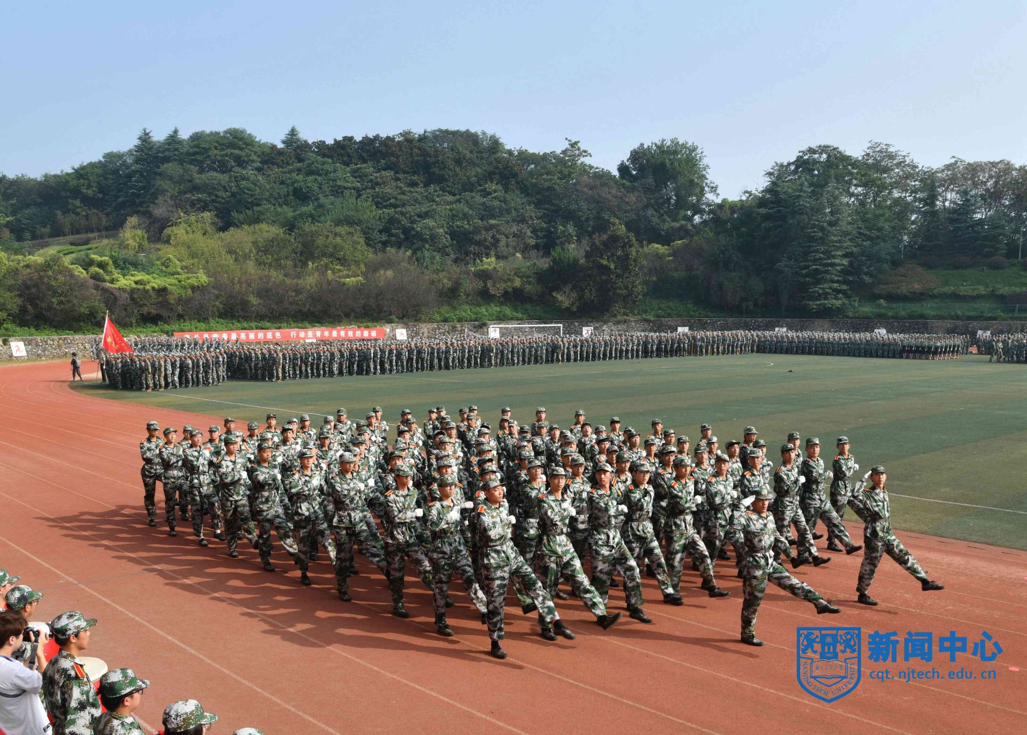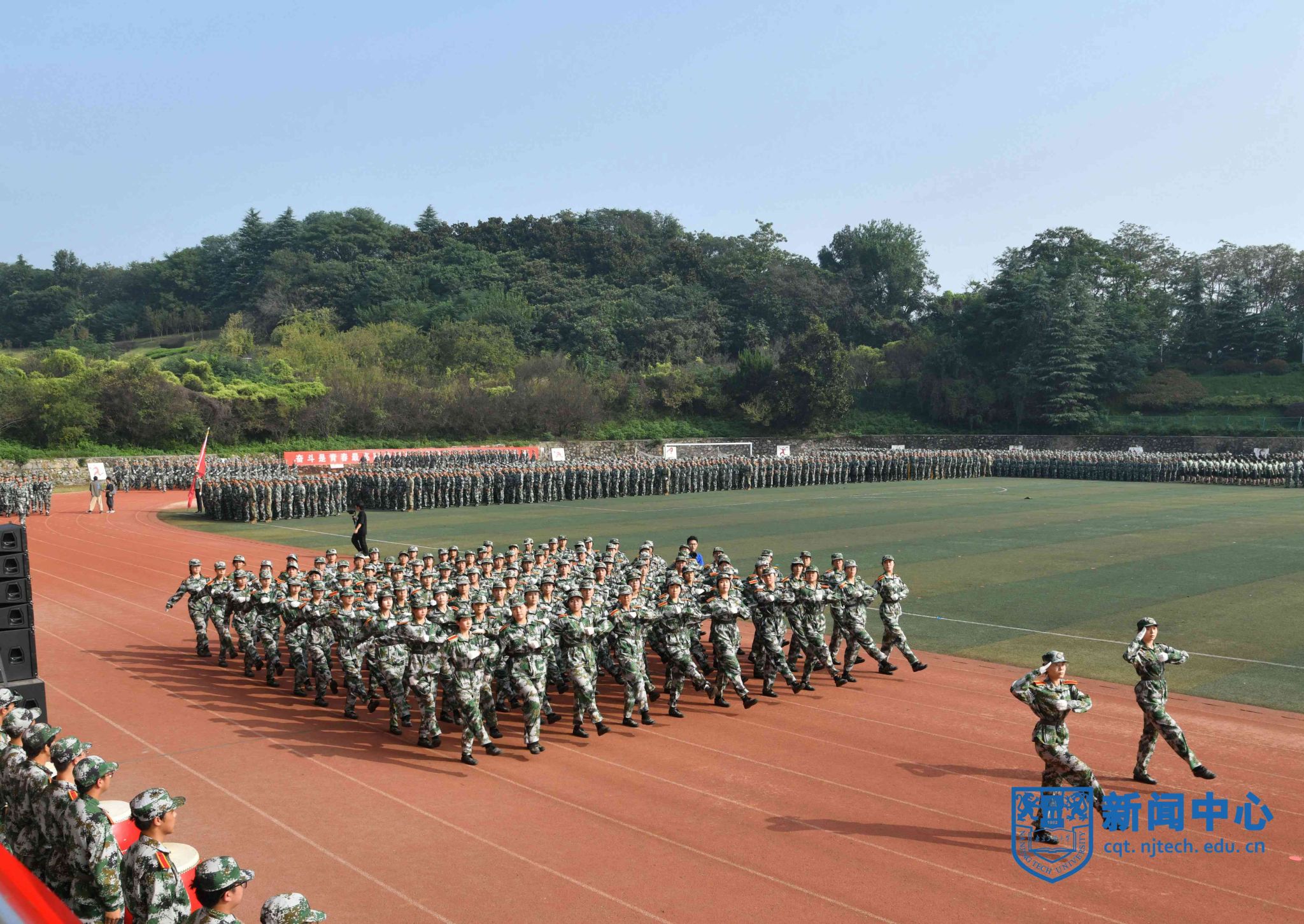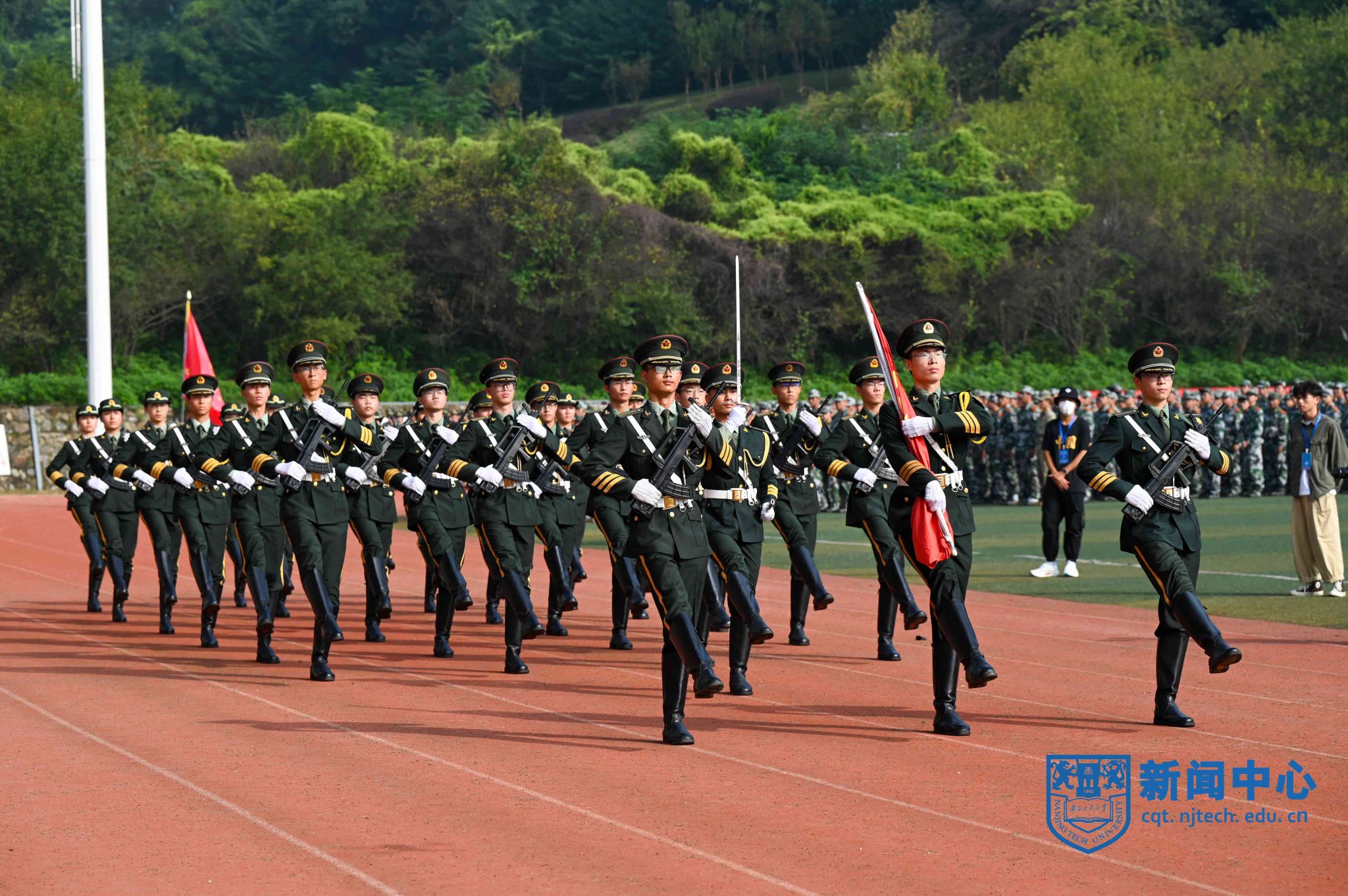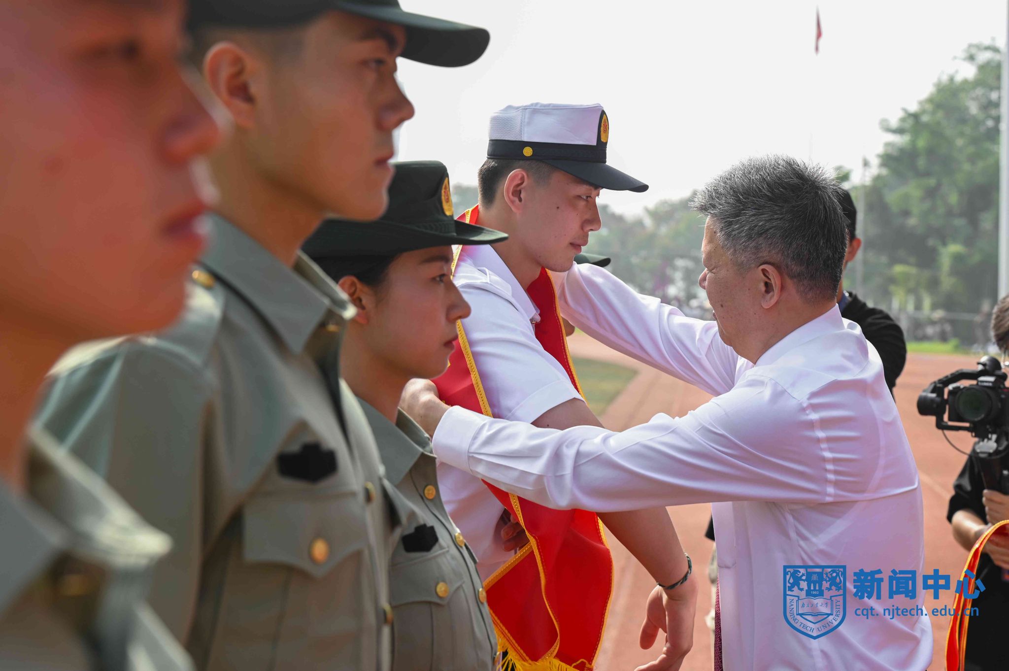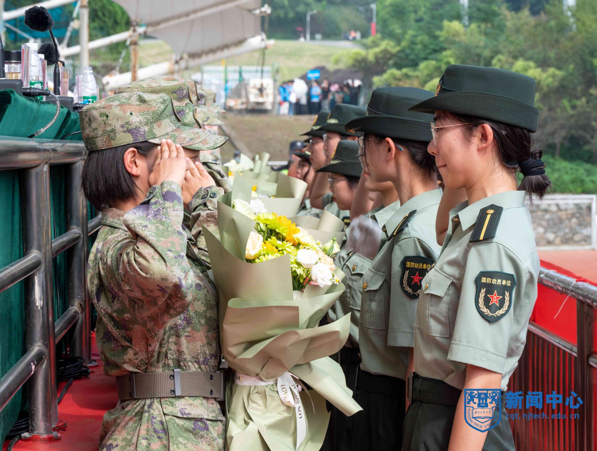 上午八时三十分,在升国旗仪式后,军训汇报表演正式开始。芮鸿岩为退伍大学生代表佩戴光荣返校绶带。在进行的分列式表演中,2023级本科新生组成十个方阵,精神饱满、队列整齐地通过主席台,充分展示了青春激扬的风采。随后,2023级新生们分别进行了打鼓舞旗、舞蹈、军体拳、盾棍术、匕首操、战术、刺杀操等表演。汇报表演结束后,主席台前排领导为“优秀教官”“优秀学员”等军训先进集体和先进个人代表颁奖。学生代表向承训教官代表献花致谢,蒋军成向承训部队赠送锦旗。