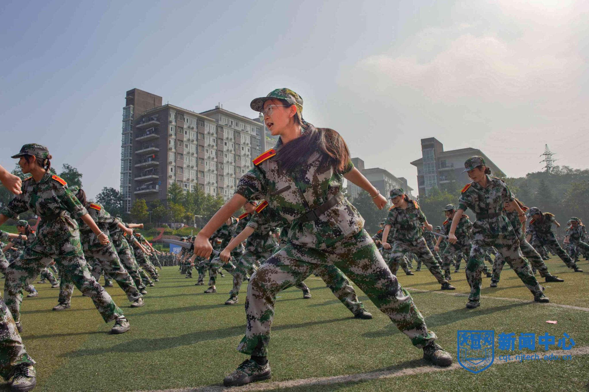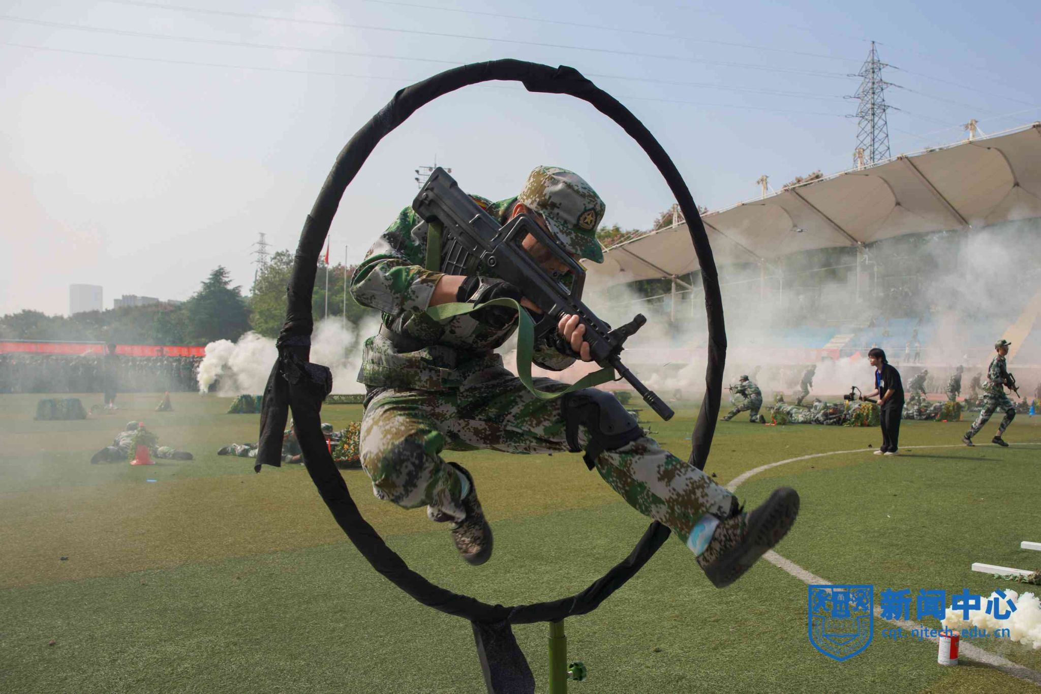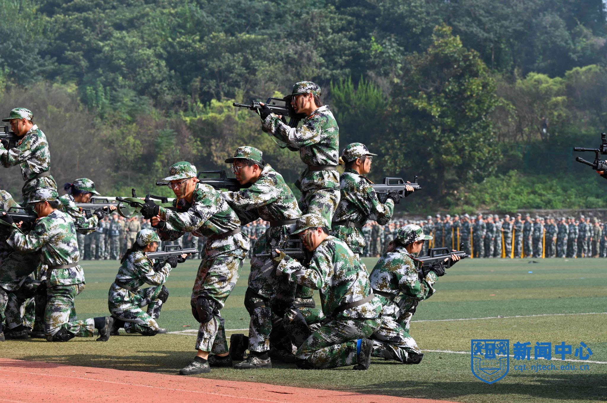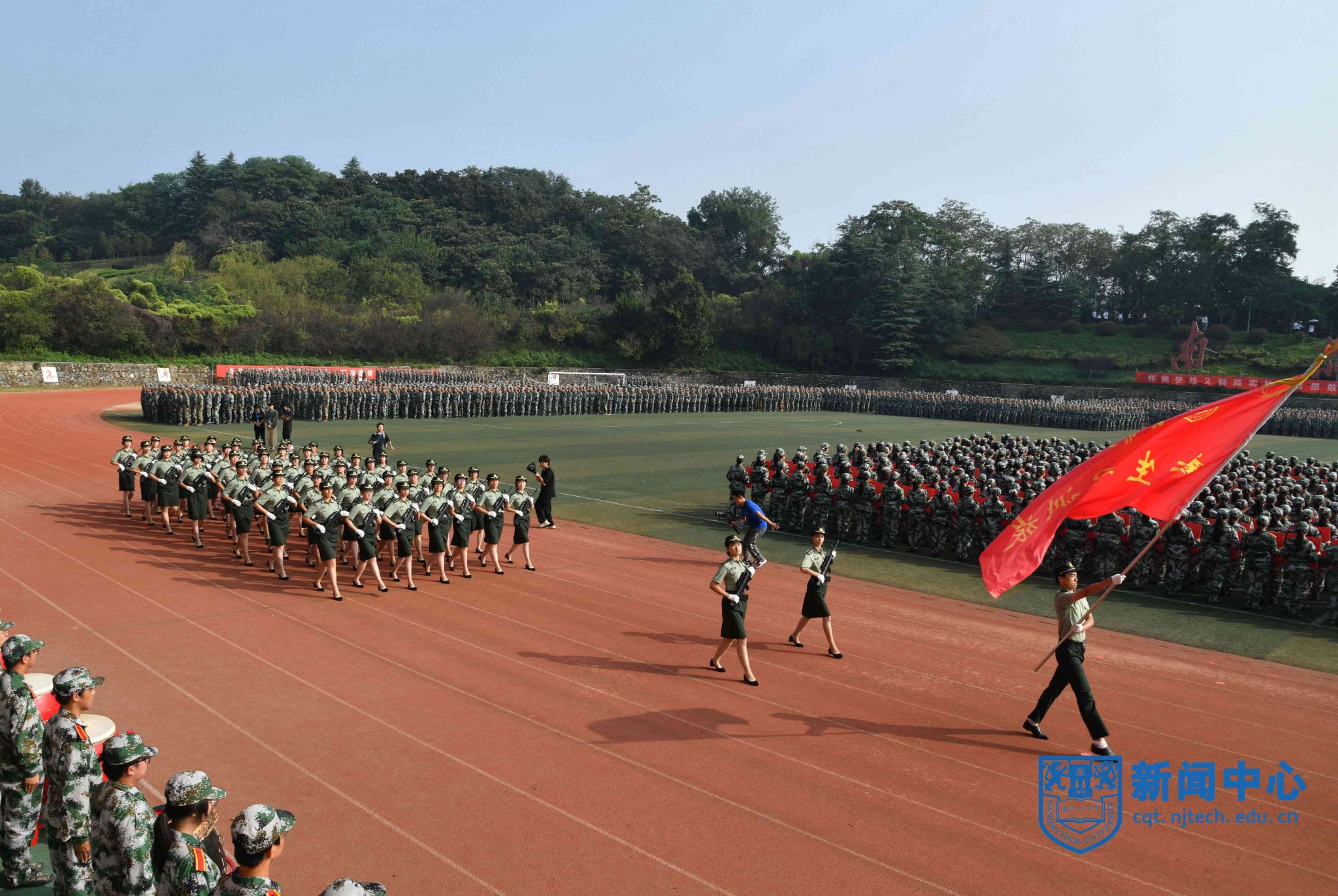 上午八时三十分,在升国旗仪式后,军训汇报表演正式开始。芮鸿岩为退伍大学生代表佩戴光荣返校绶带。在进行的分列式表演中,2023级本科新生组成十个方阵,精神饱满、队列整齐地通过主席台,充分展示了青春激扬的风采。随后,2023级新生们分别进行了打鼓舞旗、舞蹈、军体拳、盾棍术、匕首操、战术、刺杀操等表演。汇报表演结束后,主席台前排领导为“优秀教官”“优秀学员”等军训先进集体和先进个人代表颁奖。学生代表向承训教官代表献花致谢,蒋军成向承训部队赠送锦旗。