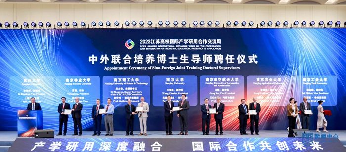 开幕式上还举行了合作协议签约仪式、合作平台成立仪式,以及联合培养博士生导师聘任仪式,凌祥副校长与约翰内斯堡大学代表一同为中南非高科技联合孵化器按下“启动键”,戴志晖副校长为外方导师颁发聘书。随后的主论坛围绕国际产学研用合作主题,由中外院士作主旨报告,并开展了两场对话会,其中,萨拉戈萨大学副校长格洛利亚·昆卡作为对话嘉宾分享了与AC米兰的创新合作实践。AC米兰特聘教授劳埃德·唐立作为江苏高校科研成果转化的两个代表案例之一作重点交流。