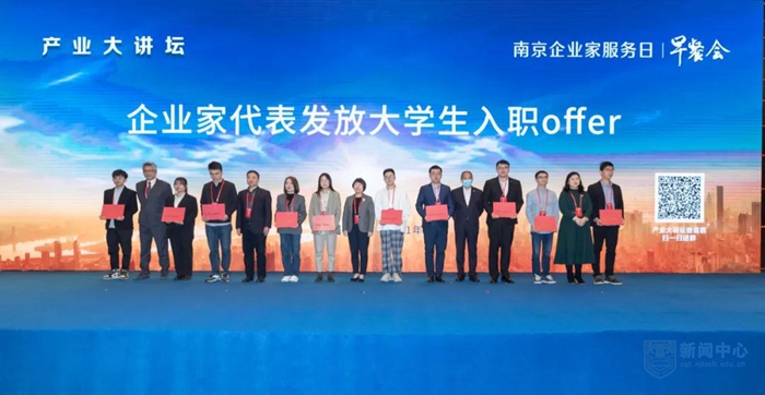 会上,周世林、芮益民校友作为企业家代表,为优秀大学毕业生代表发放了入职offer。