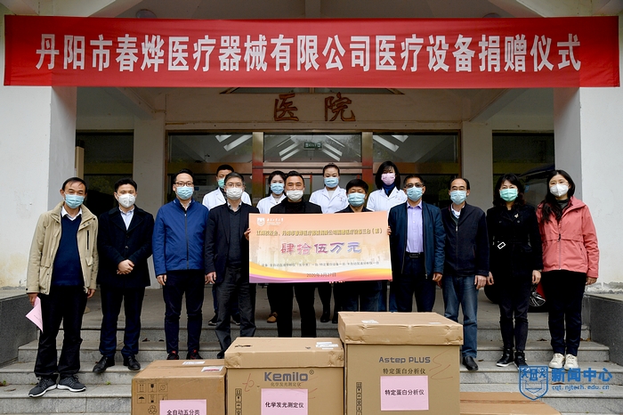 捐赠仪式在江浦校区校医院举行,后勤保障处(后勤服务集团)朱兴同处长(总经理)主持捐赠仪式。校教育发展基金会理事长、校友总会副会长兼秘书长高明接受捐赠并向捐赠单位和江阴校友会颁发捐赠证书。高明理事长首先对捐赠单位丹阳市春烨医疗器械有限公司和江阴校友会表示感谢,并表示本次捐赠的这批医疗设备将改善校医院的整体医疗水平,对学校防控疫情和后续医疗基本保障提供有力支撑。