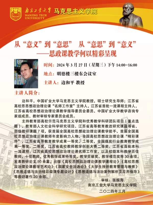 报告人简介:边和平,中国矿业大学马克思主义学院教授,硕士研究生导师;江苏省高校思思想政治理论课“名师工作室”主持人,江苏省首批一流课程主持人,江苏省高校思想政治理论课教学指导委员会委员、中国矿业大学教学咨询专家组成员、教材审核专家委员会成员。