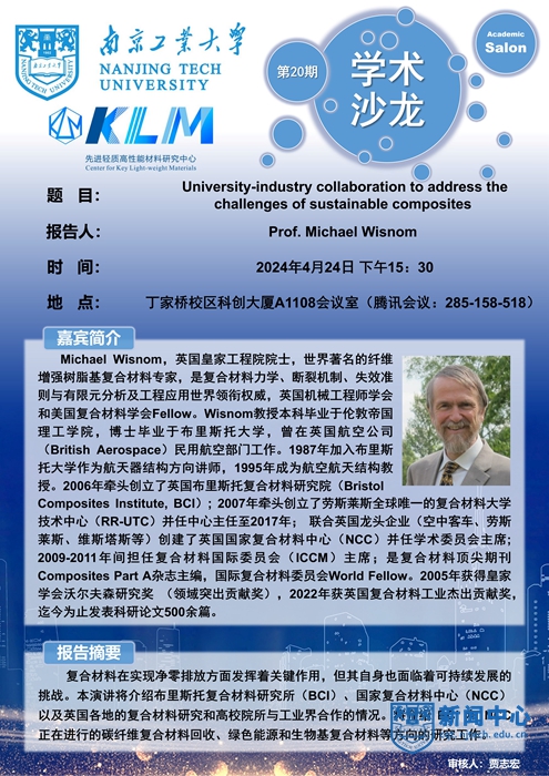 报告人简介:英国皇家工程院院士,世界著名的纤维增强树脂基复合材料专家,是复合材料力学、断裂机制、失效准则与有限元分析及工程应用世界领衔权威,英国机械工程师学会和美国复合材料学会Fellow。Wisnom教授本科毕业于伦敦帝国理工学院,博士毕业于布里斯托大学,曾在英国航空公司(British Aerospace)民用航空部门工作。1987年加入布里斯托大学作为航天器结构方向讲师,1995年成为航空航天结构教授。2006年牵头创立了英国布里斯托复合材料研究院(Bristol Composites Institute, BCI);2007年牵头创立了劳斯莱斯全球唯一的复合材料大学技术中心(RR-UTC)并任中心主任至2017年;联合英国龙头企业(空中客车、劳斯莱斯、维斯塔斯等)创建了英国国家复合材料中心(NCC)并任学术委员会主席;2009-2011年间担任复合材料国际委员会(ICCM)主席;是复合材料顶尖期刊Composites Part A杂志主编,国际复合材料委员会World Fellow。2005年获得皇家学会沃尔夫森研究奖(领域突出贡献奖),2022年获英国复合材料工业杰出贡献奖,迄今为止发表科研论文500余篇。