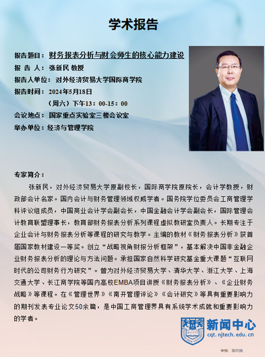 报告人简介:张新民,对外经济贸易大学原副校长,国际商学院原院长,会计学教授,财政部会计名家。国内会计与财务管理领域权威学者。国务院学位委员会工商管理学科评议组成员,中国商业会计学会副会长,中国金融会计学会副会长,国际管理会计教育联盟理事长,教育部财务报表分析系列课程虚拟教研室负责人。长期专注于企业会计与财务报表分析等课程的研究与教学。主编的教材《财务报表分析》获首届国家教材建设一等奖。创立“战略视角财报分析框架”,基本解决中国非金融企业财务报表分析的理论与方法问题。承担国家自然科学研究基金重大课题“互联网时代的公司财务行为研究”。曾为对外经济贸易大学、清华大学、浙江大学、上海交通大学、长江商学院等国内高校EMBA项目讲授《财务报表分析》、《企业财务战略》等课程。在《管理世界》《南开管理评论》《会计研究》等具有重要影响力的期刊发表专业论文50余篇,是中国工商管理界具有系统学术成就和重要影响力的学者。