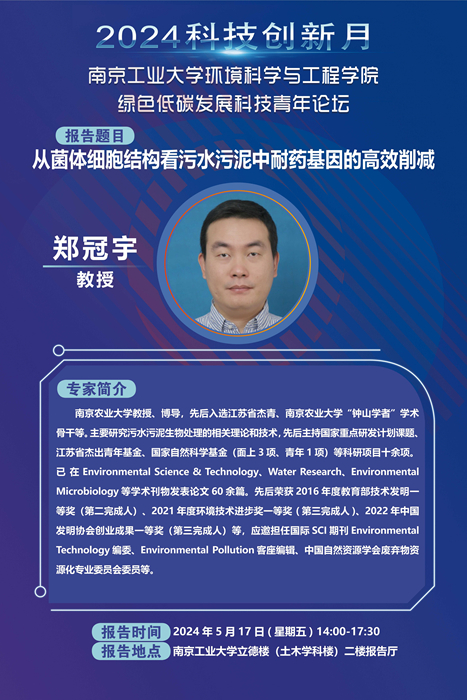 14:40-15:10 | 郑冠宇 | 南京农业大学教授 | 从菌体细胞结构看污水污泥中耐药基因的高效削减 |