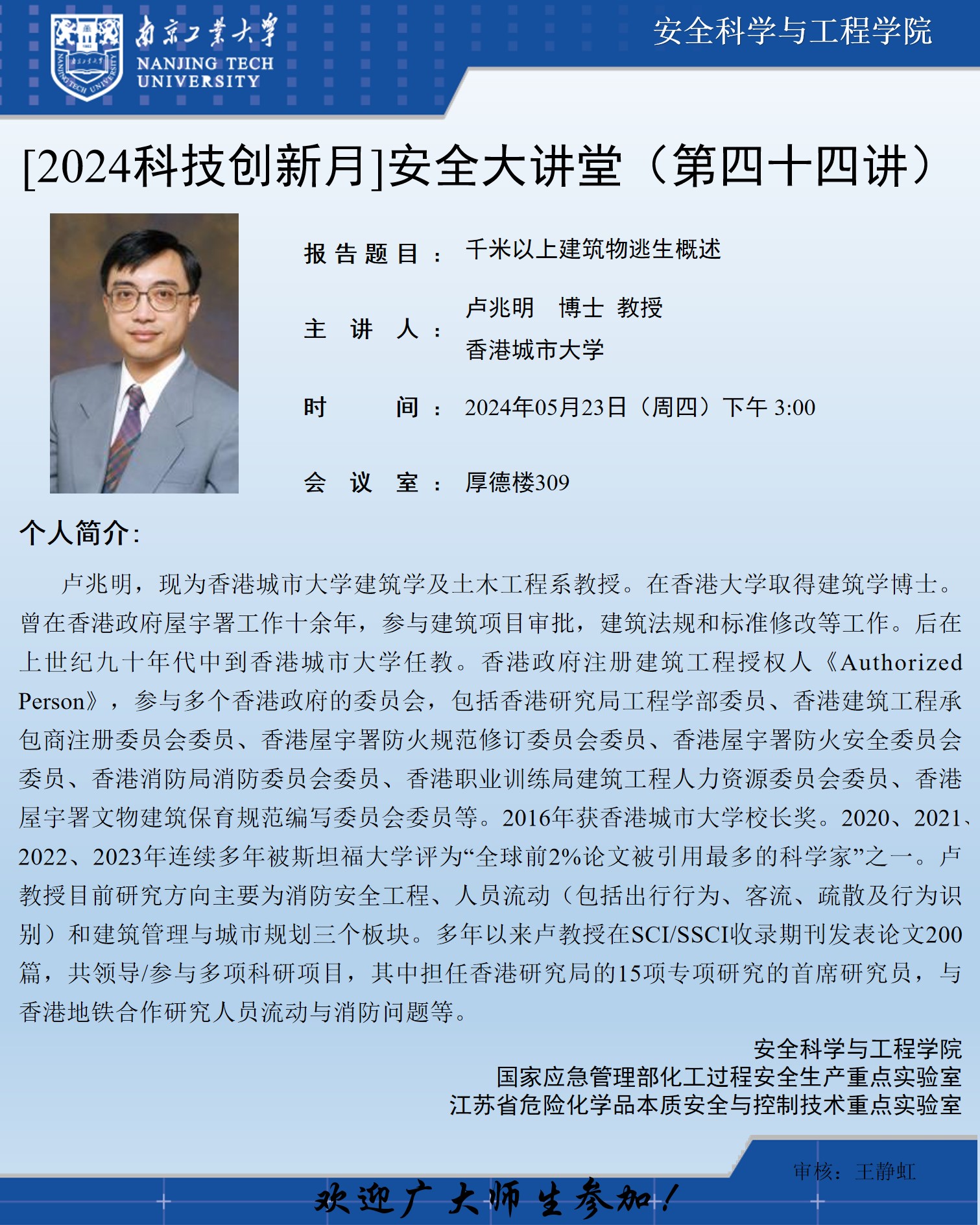报告人简介:卢兆明,现为香港城市大学建筑学及土木工程系教授。在香港大学取得建筑学博士。曾在香港政府屋宇署工作十余年,参与建筑项目审批,建筑法规和标准修改等工作。后在上世纪九十年代中到香港城市大学任教。香港政府注册建筑工程授权人《Authorized Person》,参与多个香港政府的委员会,包括香港研究局工程学部委员、香港建筑工程承包商注册委员会委员、香港屋宇署防火规范修订委员会委员、香港屋宇署防火安全委员会委员、香港消防局消防委员会委员、香港职业训练局建筑工程人力资源委员会委员、香港屋宇署文物建筑保育规范编写委员会委员等。2016年获香港城市大学校长奖。2020、2021、2022、2023年连续多年被斯坦福大学评为“全球前2%论文被引用最多的科学家”之一。卢教授目前研究方向主要为消防安全工程、人员流动(包括出行行为、客流、疏散及行为识别)和建筑管理与城市规划三个板块。多年以来卢教授在SCI/SSCI收录期刊发表论文200篇,共领导/参与多项科研项目,其中担任香港研究局的15项专项研究的首席研究员,与香港地铁合作研究人员流动与消防问题等。