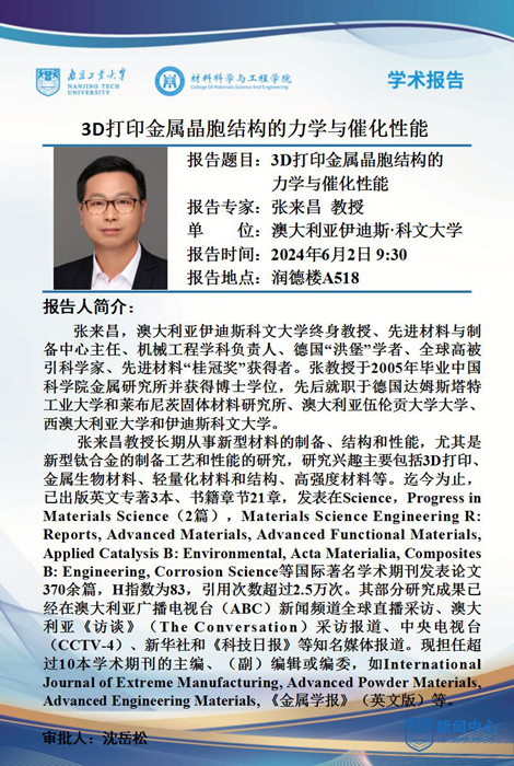 报告人简介:张来昌,澳大利亚伊迪斯科文大学终身教授、先进材料与制备中心主任、机械工程学科负责人、德国“洪堡”学者、全球高被引科学家、先进材料“桂冠奖”获得者。张教授于2005年毕业中国科学院金属研究所并获得博士学位,先后就职于德国达姆斯塔特工业大学和莱布尼茨固体材料研究所、澳大利亚伍伦贡大学大学、西澳大利亚大学和伊迪斯科文大学。