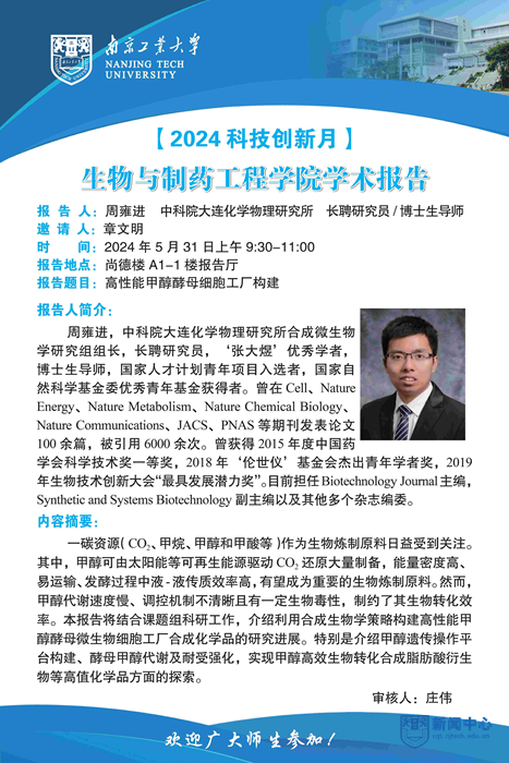 报告人简介:周雍进,中科院大连化学物理研究所合成微生物学研究组组长,长聘研究员,‘张大煜’优秀学者,博士生导师,国家人才计划青年项目入选者,国家自然科学基金委优秀青年基金获得者。曾在Cell、Nature Energy、Nature Metabolism、Nature Chemical Biology、Nature Communications、JACS、PNAS等期刊发表论文100余篇,被引用6000余次。曾获得2015年度中国药学会科学技术奖一等奖,2018年‘伦世仪’基金会杰出青年学者奖,2019年生物技术创新大会“最具发展潜力奖”。目前担任Biotechnology Journal主编,Synthetic and Systems Biotechnology副主编以及其他多个杂志编委。