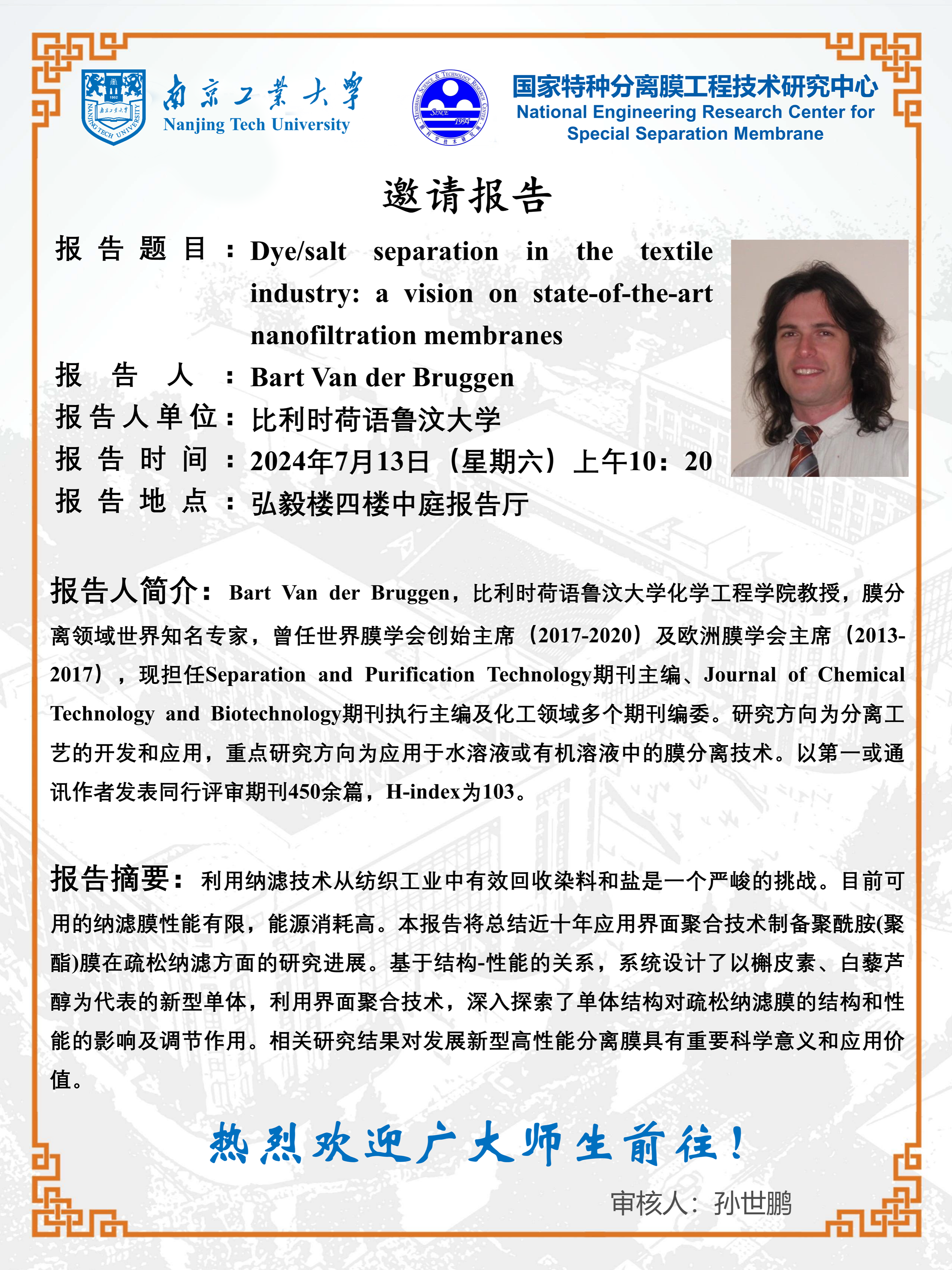 报告人简介:Bart Van der Bruggen,比利时荷语鲁汶大学化学工程学院教授,膜分离领域世界知名专家,曾任世界膜学会创始主席(2017-2020)及欧洲膜学会主席(20132017),现担任Separation and Purification Technology期刊主编、Journal of ChemicaTechnology and Biotechnology期刊执行主编及化工领域多个期刊编委。研究方向为分离工艺的开发和应用,重点研究方向为应用于水溶液或有机溶液中的膜分离技术。以第一或通讯作者发表同行评审期刊450余篇,H-index为103。