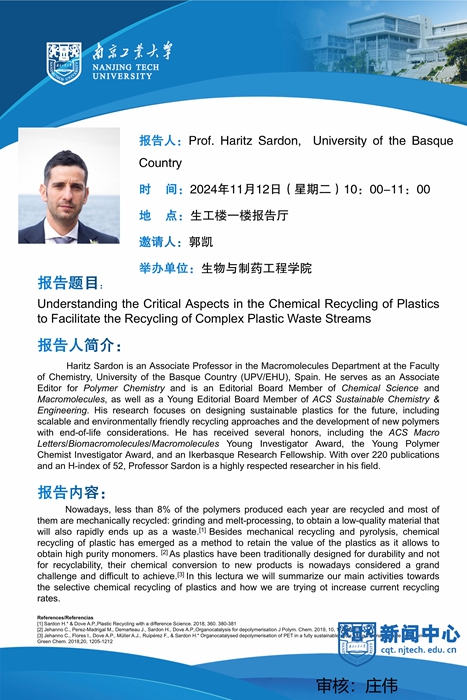 报告人简介:Haritz Sardon is an Associate Professor in the Macromolecules Department at the Faculty of Chemistry, University of the Basque Country (UPV/EHU), Spain. He serves as an Associate Editor forPolymer Chemistryand is an Editorial Board Member ofChemical ScienceandMacromolecules, as well as a Young Editorial Board Member ofACS Sustainable Chemistry & Engineering. His research focuses on designing sustainable plastics for the future, including scalable and environmentally friendly recycling approaches and the development of new polymers with end-of-life considerations. He has received several honors, including theACS Macro Letters/Biomacromolecules/MacromoleculesYoung Investigator Award, the Young Polymer Chemist Investigator Award, and an Ikerbasque Research Fellowship. With over 220 publications and an H-index of 52, Professor Sardon is a highly respected researcher in his field.