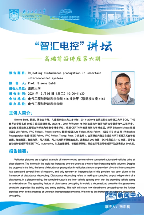 报告摘要:Vehicular platoons are a typical example of interconnected system where connected automated vehicles drive at close distance. The interest in this topic has increased over the years as a way to face increasing traffic volumes. Despite the progress in the field, the issue of disturbance propagation in vehicular platoons as per effect of control interconnection has stimulated several lines of research, and only recently an interpretation of this problem has been given in the framework of disturbance decoupling. Disturbance decoupling refers to making a controlled output independent of a disturbance. In a platoon setting, the controlled output is the inter-vehicle spacing error, with the preceding vehicle acting as a disturbance. The appealing feature of disturbance decoupling is to yield a decentralized controller that guarantees desirable properties like stability and string stability. This talk will show how disturbance decoupling can be further exploited even in the presence of uncertain interconnected systems. We refer to this framework as adaptive disturbance decoupling.