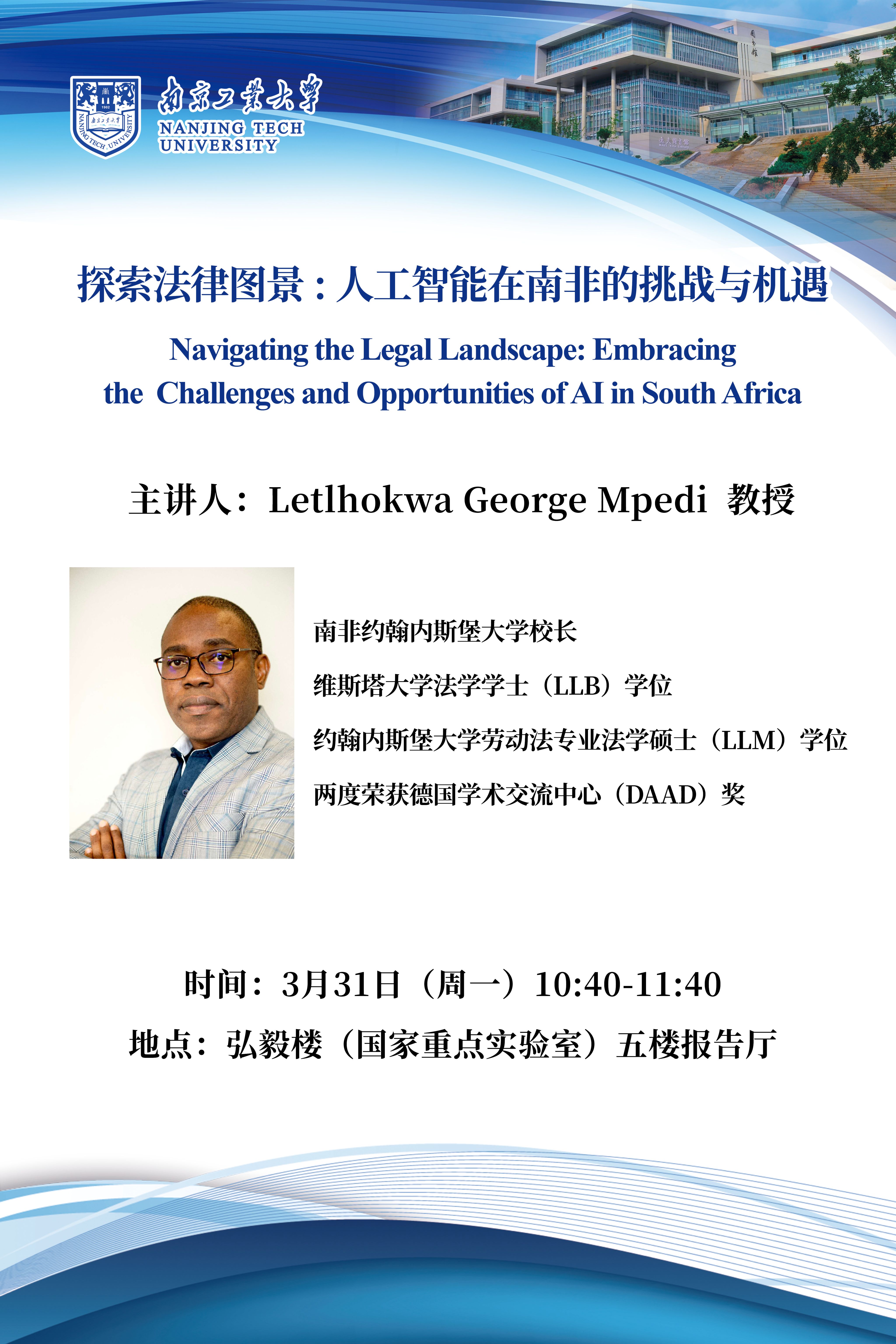 报告人简介:Letlhokwa George Mpedi教授,南非约翰内斯堡大学校长,人工智能与法律领域的专家。1998年于维斯塔大学取得法学学士(LLB)学位,2001年于约翰内斯堡大学取得劳动法专业法学硕士(LLM)学位。曾两度荣获德国学术交流中心(DAAD)奖。2000 年,Letlhokwa George Mpedi教授加入当时兰德阿非利卡大学的国际和比较劳动与社会保障法中心(CICLASS)担任研究员。2003年8月,Letlhokwa George Mpedi教授接受了德国慕尼黑马克斯·普朗克外国和国际社会法研究所的研究员职位。2006年从德国回国后,他在国际和比较劳动与社会保障法中心(CICLASS)担任副主任。同年,约翰内斯堡大学授予他商法法学博士(LLD)学位。2023年7月29日,Letlhokwa George Mpedi教授教授获得格鲁吉亚高加索大学的荣誉博士学位。在担任校长兼首席执行官这一现任职位之前,Letlhokwa George Mpedi教授曾担任约翰内斯堡大学负责学术事务的副校长兼法学院执行院长,在众多国内和国际会议上发表论文。Letlhokwa George Mpedi教授在南非、南部非洲和英语非洲地区广泛发表了关于社会保障和劳动法的著作,在法律领域建树颇丰。