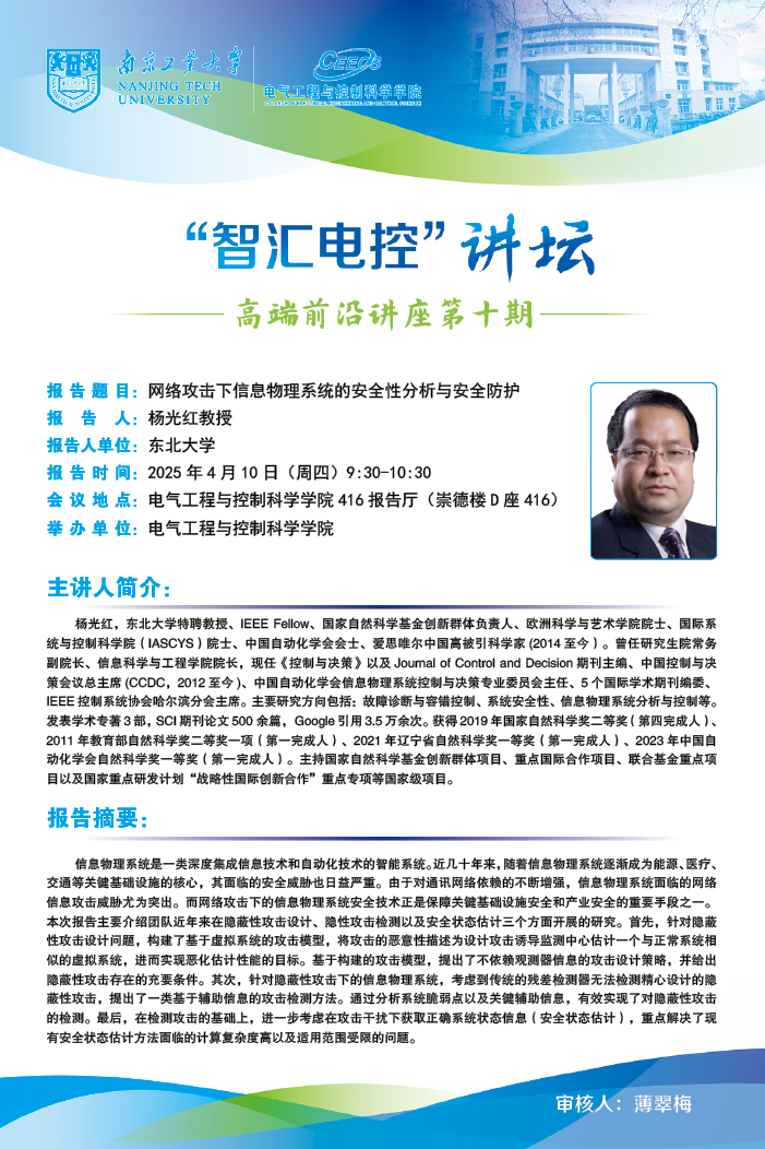 报告人简介:杨光红,东北大学特聘教授、IEEE Fellow、国家自然科学基金创新群体负责人、欧洲科学与艺术学院院士、国际系统与控制科学院(IASCYS)院士、中国自动化学会会士、爱思唯尔中国高被引科学家(2014至今)。曾任研究生院常务副院长、信息科学与工程学院院长,现任《控制与决策》以及Journal of Control and Decision期刊主编、中国控制与决策会议总主席(CCDC,2012至今)、中国自动化学会信息物理系统控制与决策专业委员会主任、5个国际学术期刊编委、IEEE控制系统协会哈尔滨分会主席。主要研究方向包括:故障诊断与容错控制、系统安全性、信息物理系统分析与控制等。发表学术专著3部,SCI期刊论文500 余篇, Google引用3.5万余次。获得2019年国家自然科学奖二等奖(第四完成人)、2011年教育部自然科学奖二等奖一项(第一完成人)、2021年辽宁省自然科学奖一等奖(第一完成人)、2023年中国自动化学会自然科学奖一等奖(第一完成人)。主持国家自然科学基金创新群体项目、重点国际合作项目、联合基金重点项目以及国家重点研发计划“战略性国际创新合作”重点专项等国家级项目。