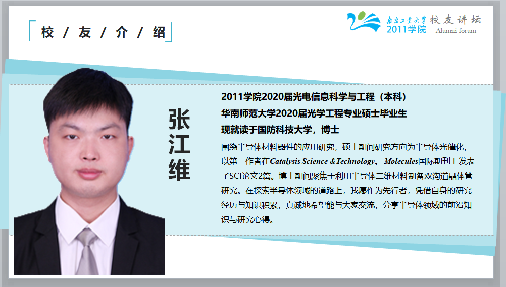 主要研究方向为半导体材料器件的应用研究。硕士期间研究方向为半导体光催化,以第一作者在Catalysis Science &Technology、 Molecules国际期刊上发表了SCI论文2篇。博士期间聚焦于利用半导体二维材料制备双沟道晶体管研究。