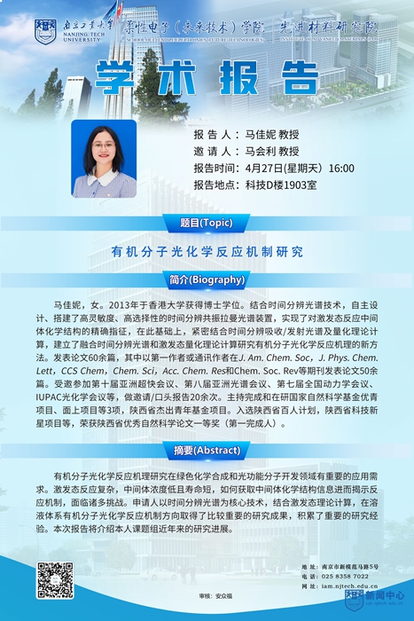 报告人简介:马佳妮,女。2013年于香港大学获得博士学位。结合时间分辨光谱技术,自主设计、搭建了高灵敏度、高选择性的时间分辨共振拉曼光谱装置,实现了对激发态反应中间体化学结构的精确指征,在此基础上,紧密结合时间分辨吸收/发射光谱及量化理论计算,建立了融合时间分辨光谱和激发态量化理论计算研究有机分子光化学反应机理的新方法。发表论文60余篇,其中以第一作者或通讯作者在J. Am. Chem. Soc,J. Phys. Chem. Lett,CCS Chem,Chem. Sci,Acc. Chem. Res和Chem. Soc. Rev等期刊发表论文50余篇。受邀参加第十届亚洲超快会议、第八届亚洲光谱会议、第七届全国动力学会议、IUPAC光化学会议等,做邀请/口头报告20余次。主持完成和在研国家自然科学基金优青项目、面上项目等3项,陕西省杰出青年基金项目。入选陕西省百人计划,陕西省科技新星项目等,荣获陕西省优秀自然科学论文一等奖(第一完成人)。