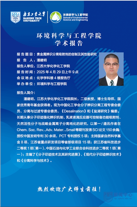 报告人简介:潘建明,江苏大学化学化工学院院长,二级教授,博士生导师,国家优秀青年基金获得者。现为中国化工学会分子辨识分离工程专委会委员、分离与过滤专委会委员、《Desalination》和《盐湖研究》编委。长期从事分子印迹强化辨识机制、乳液液滴反应器可控制备功能吸附剂、天然活性分子与战略金属离子分离纯化的研究,以第一/通讯作者在Chem. Soc. Rev.、Adv. Mater.、Small等期刊发表SCI论文150余篇;授权中国发明专利30余项,PCT专利授权5项;主持国家自然科学基金8项、江苏省重点研发项目等省部级项目15项;获江苏省科技进步二等奖1项(第一)、中国石油与化学工业联合会科技进步二等奖1项(第一);主编了《分子印迹技术及其研究进展》、《现代分子印迹辨识技术》和《分离科学与技术》。