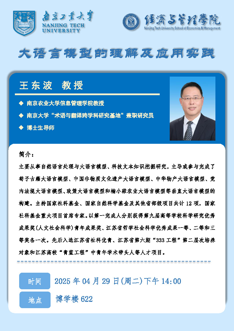 报告人简介:南京农业大学信息管理学院教授、南京大学“术语与翻译跨学科研究基地”兼职研究员、博士生导师。主要从事自然语言处理与大语言模型、科技文本知识挖掘研究,主导或参与完成了荀子古籍大语言模型、中国非物质文化遗产大语言模型、中华物产大语言模型、党内法规大语言模型、政策大语言模型和楠小秾农业大语言模型等垂直大语言模型的构建。主持国家社科基金、国家自然科学基金及其他省部级项目共计12项,国家社科基金重大项目首席专家。以第一完成人分别获得第九届高等学校科学研究优秀成果奖(人文社会科学)青年成果奖、江苏省哲学社会科学优秀成果一等、二等和三等奖各一次。先后入选江苏省社科优青、江苏省第六期“333工程”第二层次培养对象和江苏高校“青蓝工程”中青年学术带头人等人才项目。