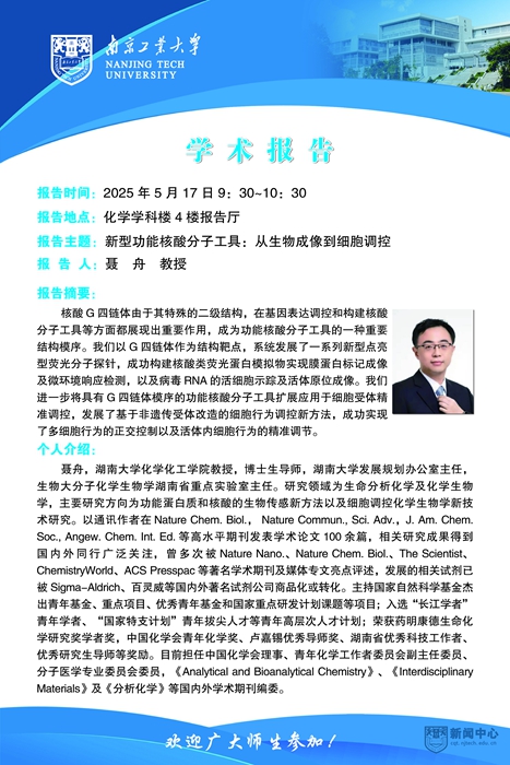 报告人简介:聂舟,湖南大学化学化工学院教授,博士生导师,湖南大学发展规划办公室主任,生物大分子化学生物学湖南省重点实验室主任。研究领域为生命分析化学及化学生物学,主要研究方向为功能蛋白质和核酸的生物传感新方法以及细胞调控化学生物学新技术研究。以通讯作者在Nature Chem. Biol.,Nature Commun., Sci. Adv.,J. Am. Chem. Soc., Angew. Chem. Int. Ed.等高水平期刊发表学术论文100余篇,相关研究成果得到国内外同行广泛关注,曾多次被Nature Nano.、Nature Chem. Biol.、The Scientist、ChemistryWorld、ACS Presspac等著名学术期刊及媒体专文亮点评述,发展的相关试剂已被Sigma-Aldrich、百灵威等国内外著名试剂公司商品化或转化。主持国家自然科学基金杰出青年基金、重点项目、优秀青年基金和国家重点研发计划课题等项目;入选“国家特支计划”青年拔尖人才等青年高层次人才计划;荣获药明康德生命化学研究奖学者奖,中国化学会青年化学奖、卢嘉锡优秀导师奖、湖南省优秀科技工作者、优秀研究生导师等奖励。目前担任中国化学会理事、青年化学工作者委员会副主任委员、分子医学专业委员会委员,《Analytical and Bioanalytical Chemistry》、《Interdisciplinary Materials》及《分析化学》等国内外学术期刊编委。