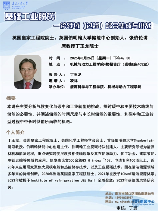 报告人简介:丁玉龙,英国皇家工程院院士、英国化学工程师学会会士、首任伯明翰大学Chamberlain讲习教授、伯明翰储能中心创建主任、伯明翰工业脱碳特队创建人。主要研究领域为能源材料和能源过程,重点研究跨度尺度多相传输现象及其在能源动力、化工冶金、建筑节能、冷链运输等领域的应用。他发表论文500余篇GS H index ~102。申请专利100项以上,近20年来应用研究聚焦大规模电能和热能储存技术,以及工业脱碳技术。他发明的液态空气储能技术已开始大规模商业化建设(英国Highview Power),该技术获2011年‘The Engineer’能源和环境奖及综合奖和2012年Rushlight能源环境及输发电奖;发展的复合相变材料已在可再生能源、电网调峰和清洁供暖等领域实现大规模应用(金合能源),总装机约1000MW/8GWh,该技术获2019年IChemE全球能源奖和杰出贡献奖;发展的基于复合相变储冷的被动式冷链运输技术已开始规模化商业示范应用(中国中车石家庄公司)。因在清洁能源领域多年来的持续创新,2020年当选英国皇家工程院院士;2021年被授予IChemE清洁能源奖章;2023年被授予Institute of refrigeration J&E Hall 金质奖章;2023年获德国洪堡研究奖。