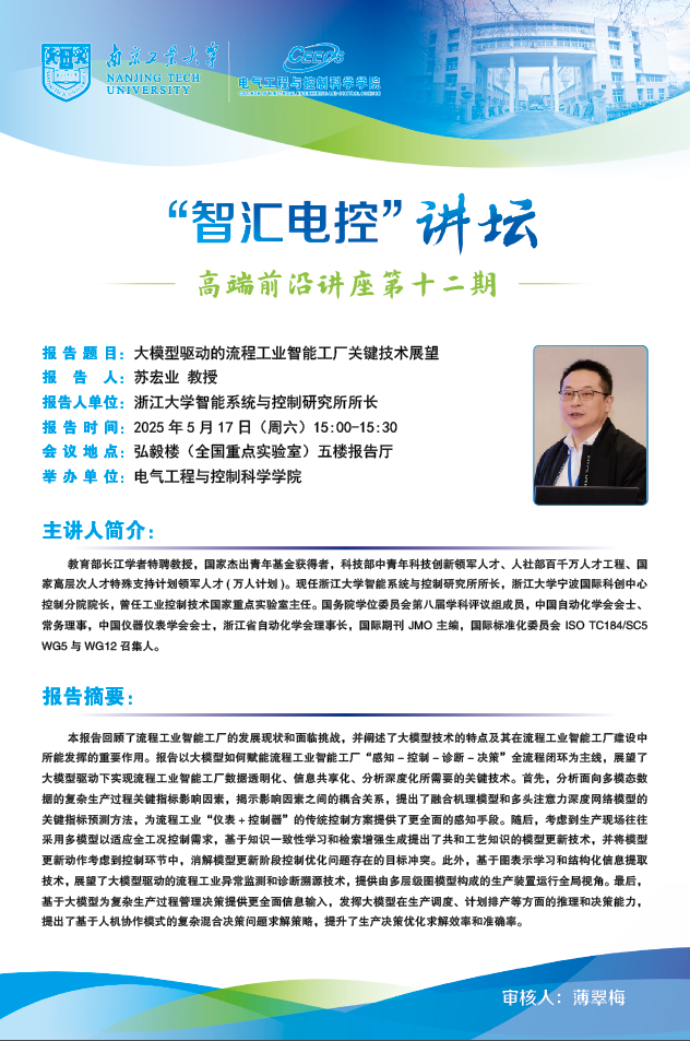 报告人简介:教育部特聘教授,国家杰出青年基金获得者,科技部中青年科技创新领军人才、人社部百千万人才工程、国家高层次人才特殊支持计划领军人才。现任浙江大学智能系统与控制研究所所长,浙江大学宁波国际科创中心控制分院院长,曾任工业控制技术国家重点实验室主任。国务院学位委员会第八届学科评议组成员,中国自动化学会会士、常务理事,中国仪器仪表学会会士,浙江省自动化学会理事长,国际期刊 JMO 主编,国际标准化委员会 ISO TC184/SC5 WG5与 WG12 召集人。