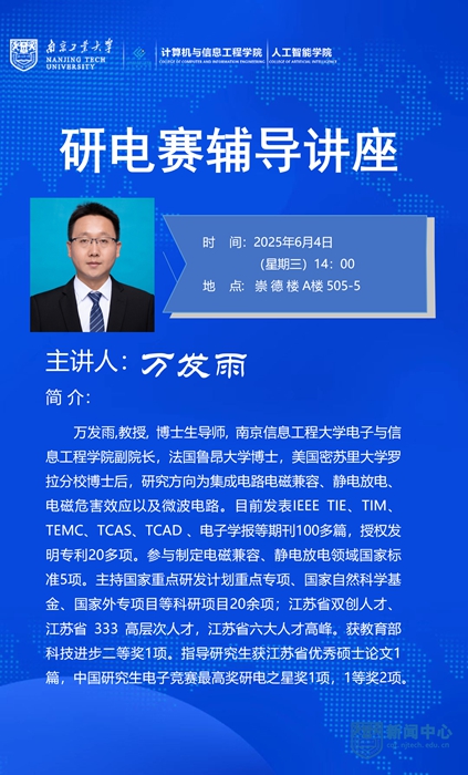 报告人简介:万发雨,教授, 博士生导师,南京信息工程大学电子与信息工程学院副院长,法国鲁昂大学博士,美国密苏里大学罗拉分校博士后,研究方向为集成电路电磁兼容、静电放电、电磁危害效应以及微波电路。目前发表IEEE TIE、TIM、TEMC、TCAS、TCAD 、电子学报等期刊100多篇,授权发明专利20多项。参与制定电磁兼容、静电放电领域国家标准5项。主持国家重点研发计划重点专项、国家自然科学基金、国家外专项目等科研项目20余项;江苏省双创人才、江苏省 333 高层次人才,江苏省六大人才高峰。获教育部科技进步二等奖1项。指导研究生获江苏省优秀硕士论文1篇,中国研究生电子竞赛最高奖研电之星奖1项,1等奖2项。