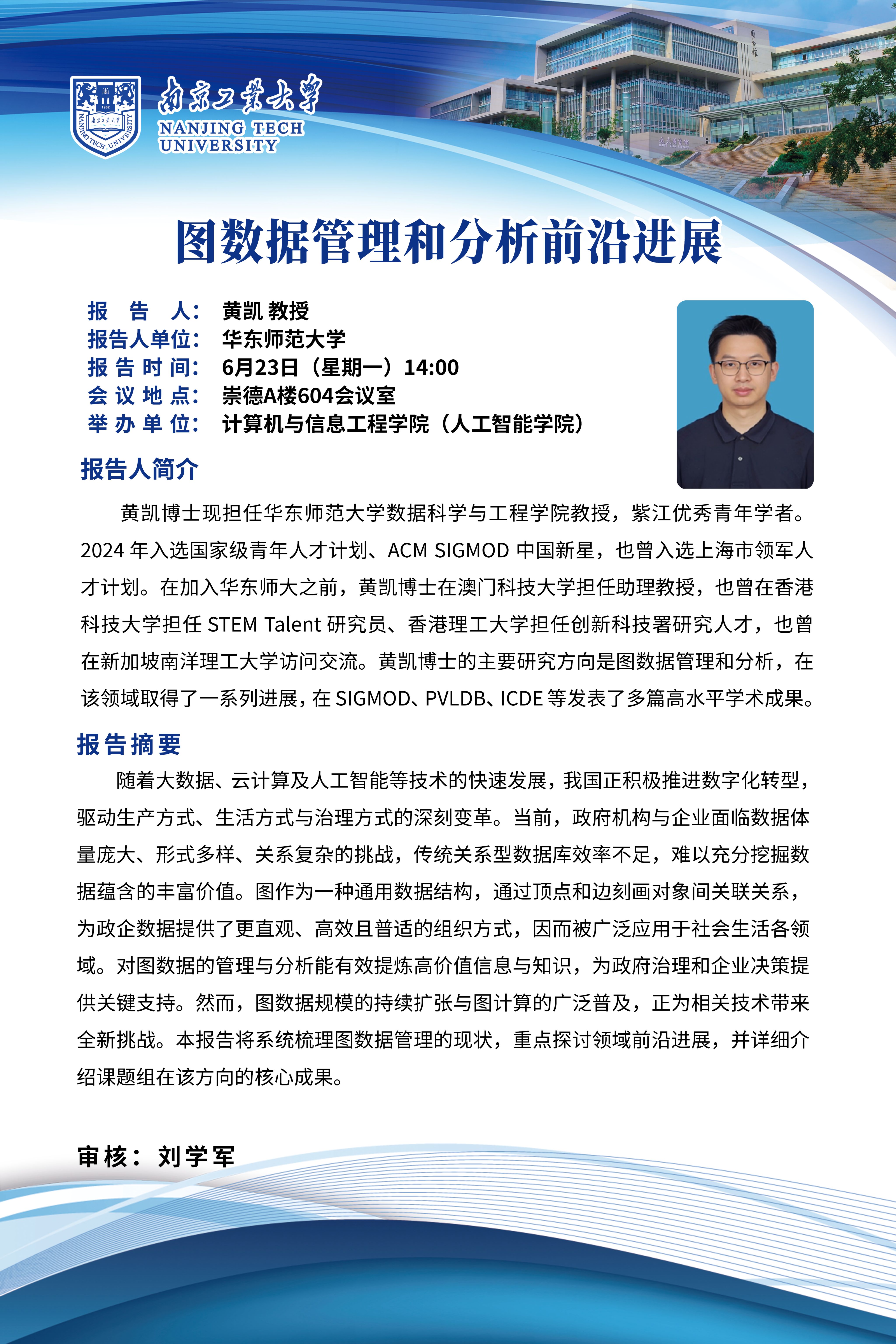 黄凯博士现担任华东师范大学数据科学与工程学院教授,紫江优秀青年学者。2024年入选国家级青年人才计划、ACM SIGMOD 中国新星,也曾入选上海市领军人才计划。在加入华东师大之前,黄凯博士在澳门科技大学担任助理教授,也曾在香港科技大学担任STEM Talent研究员、香港理工大学担任创新科技署研究人才,也曾在新加坡南洋理工大学访问交流。黄凯博士的主要研究方向是图数据管理和分析,在该领域取得了一系列进展,在SIGMOD、PVLDB、ICDE等发表了多篇高水平学术成果。