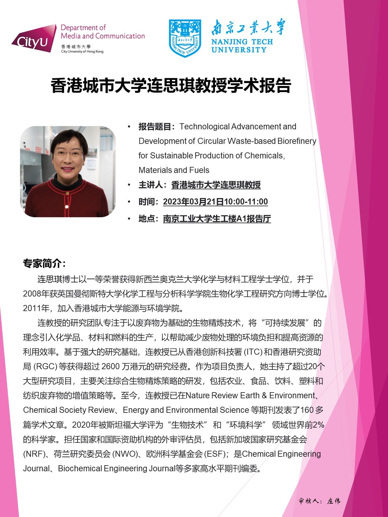 报告人简介:连思琪博士以一等荣誉获得新西兰奥克兰大学化学与材料工程学士学位,并于2008年获英国曼彻斯特大学化学工程与分析科学学院生物化学工程研究方向博士学位。2011年,加入香港城市大学能源与环境学院。