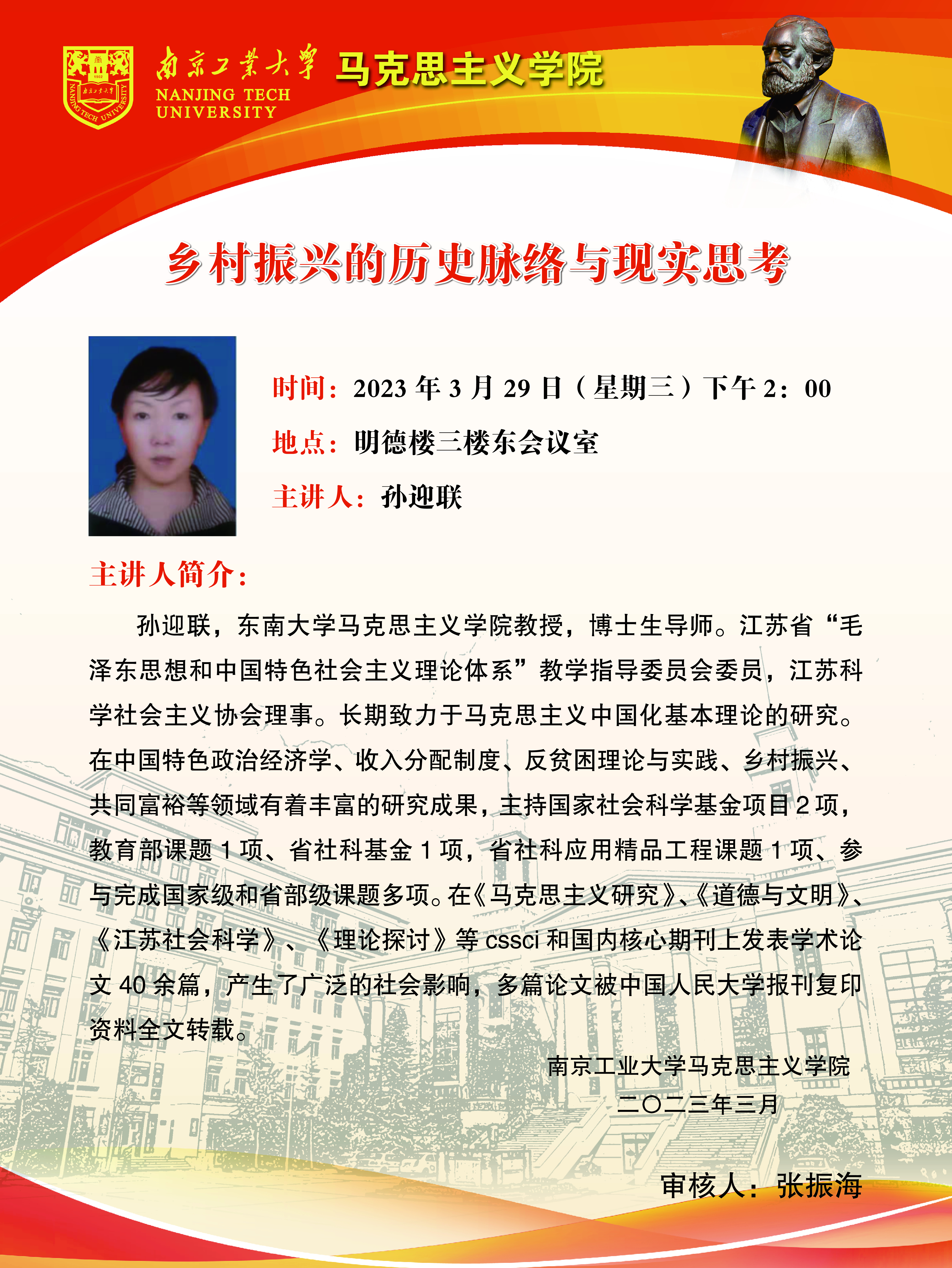 报告人简介:孙迎联,东南大学马克思主义学院教授,博士生导师。江苏省“毛泽东思想和中国特色社会主义理论体系”教学指导委员会委员,江苏科学社会主义协会理事。长期致力于马克思主义中国化基本理论的研究。在中国特色政治经济学、收入分配制度、反贫困理论与实践、乡村振兴、共同富裕等领域有着丰富的研究成果,主持国家社会科学基金项目2项,教育部课题1项、省社科基金1项,省社科应用精品工程课题1项、参与完成国家级和省部级课题多项。在《马克思主义研究》、《道德与文明》、《江苏社会科学》、《理论探讨》等cssci和国内核心期刊上发表学术论文40余篇,产生了广泛的社会影响,多篇论文被中国人民大学报刊复印资料全文转载。