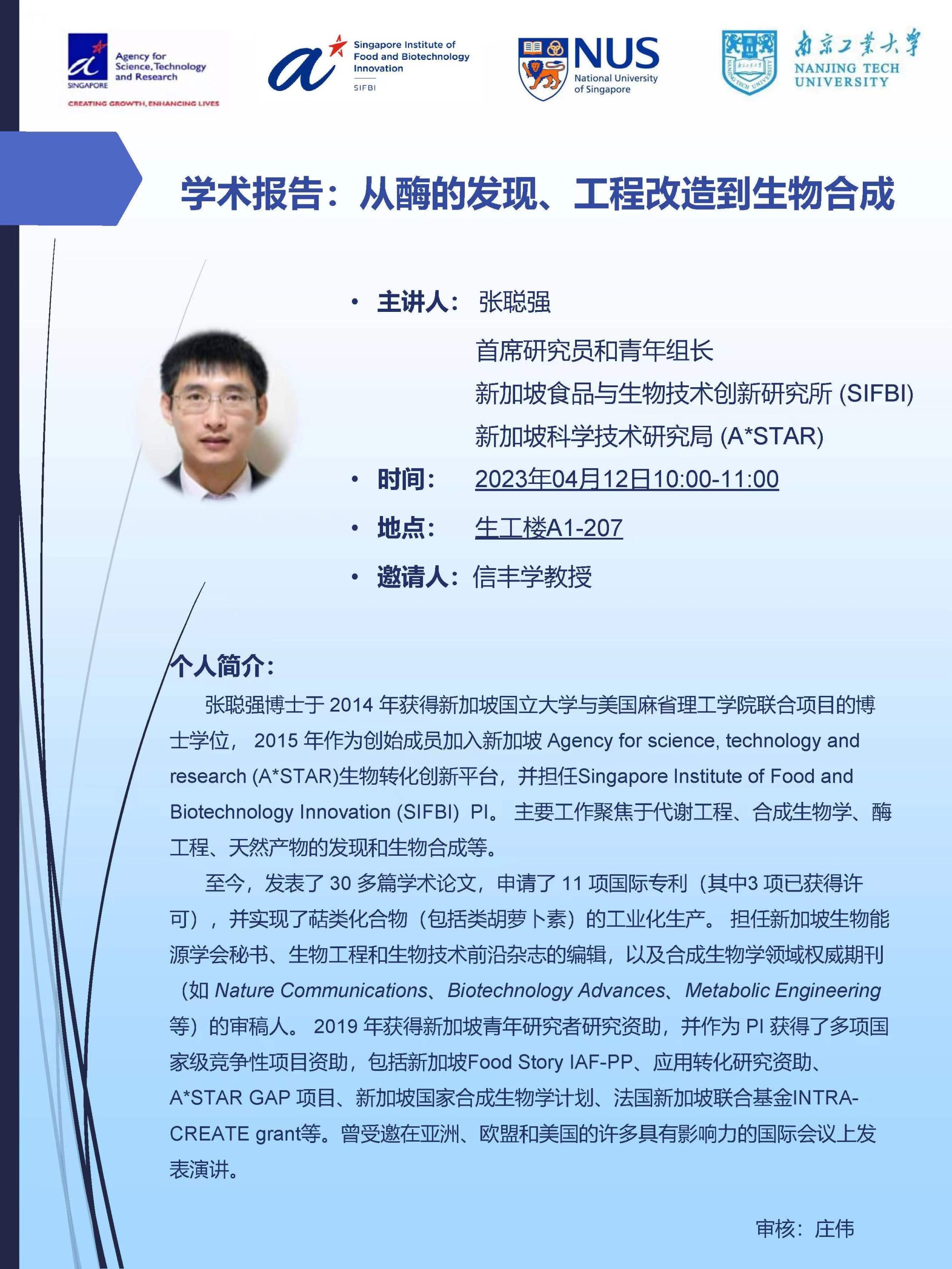 张聪强博士于2014年获得新加坡国立大学与麻省理工学院联合项目的博士学位。2015年作为创始成员加入 A*STAR 生物转化创新平台。现在是 SIFBI 的 PI,领导一个团队从事多个学术和工业界项目。主要工作聚焦于代谢工程、合成生物学、酶工程、天然产物的发现和生物合成等。