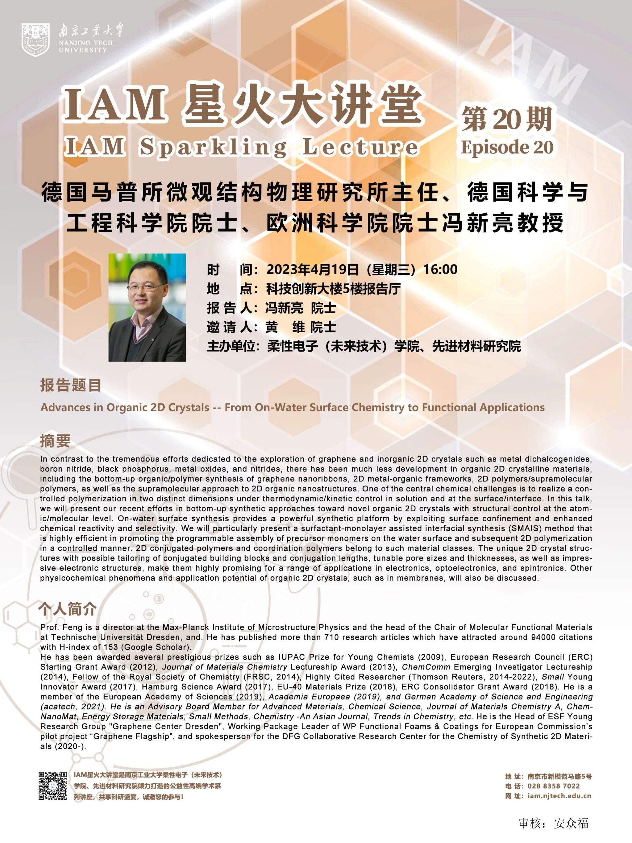 报告人简介:Prof. Feng is a director at the Max-Planck Institute of Microstructure Physics and the head of the Chair of Molecular Functional Materials at Technische Universität Dresden, and. He has published more than 710 research articles which have attracted around 94000 citations with H-index of 153 (Google Scholar). He has been awarded several prestigious prizes such as IUPAC Prize for Young Chemists (2009), European Research Council (ERC) Starting Grant Award (2012),Journal of Materials ChemistryLectureship Award (2013),ChemCommEmerging Investigator Lectureship (2014), Fellow of the Royal Society of Chemistry (FRSC, 2014), Highly Cited Researcher (Thomson Reuters, 2014-2022),SmallYoung Innovator Award (2017), Hamburg Science Award (2017), EU-40 Materials Prize (2018), ERC Consolidator Grant Award (2018). He is a member of the European Academy of Sciences (2019), Academia Europaea (2019), and German Academy of Science and Engineering (acatech, 2021). He is an Advisory Board Member forAdvanced Materials, Chemical Science, Journal of Materials Chemistry A, ChemNanoMat, Energy Storage Materials, Small Methods, Chemistry -An Asian Journal, Trends in Chemistry, etc. He is the Head of ESF Young Research Group "Graphene Center Dresden", Working Package Leader of WP Functional Foams & Coatings for European Commission’s pilot project “Graphene Flagship”, and spokesperson for the DFG Collaborative Research Center for the Chemistry of Synthetic 2D Materials (2020-).