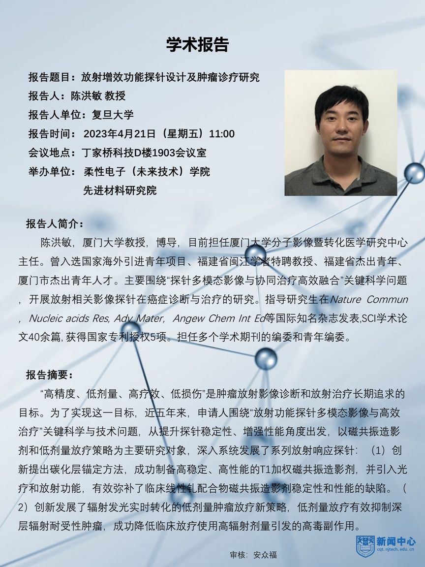 报告人简介:陈洪敏,厦门大学教授,博导,目前担任厦门大学分子影像暨转化医学研究中心主任。曾入选国家海外引进青年项目、福建省闽江学者特聘教授、福建省杰出青年、厦门市杰出青年人才。主要围绕“探针多模态影像与协同治疗高效融合”关键科学问题,开展放射相关影像探针在癌症诊断与治疗的研究。指导研究生在Nature Commun,Nucleic acids Res, Adv Mater,Angew Chem Int Ed等国际知名杂志发表,SCI学术论文40余篇, 获得国家专利授权5项。担任多个学术期刊的编委和青年编委。