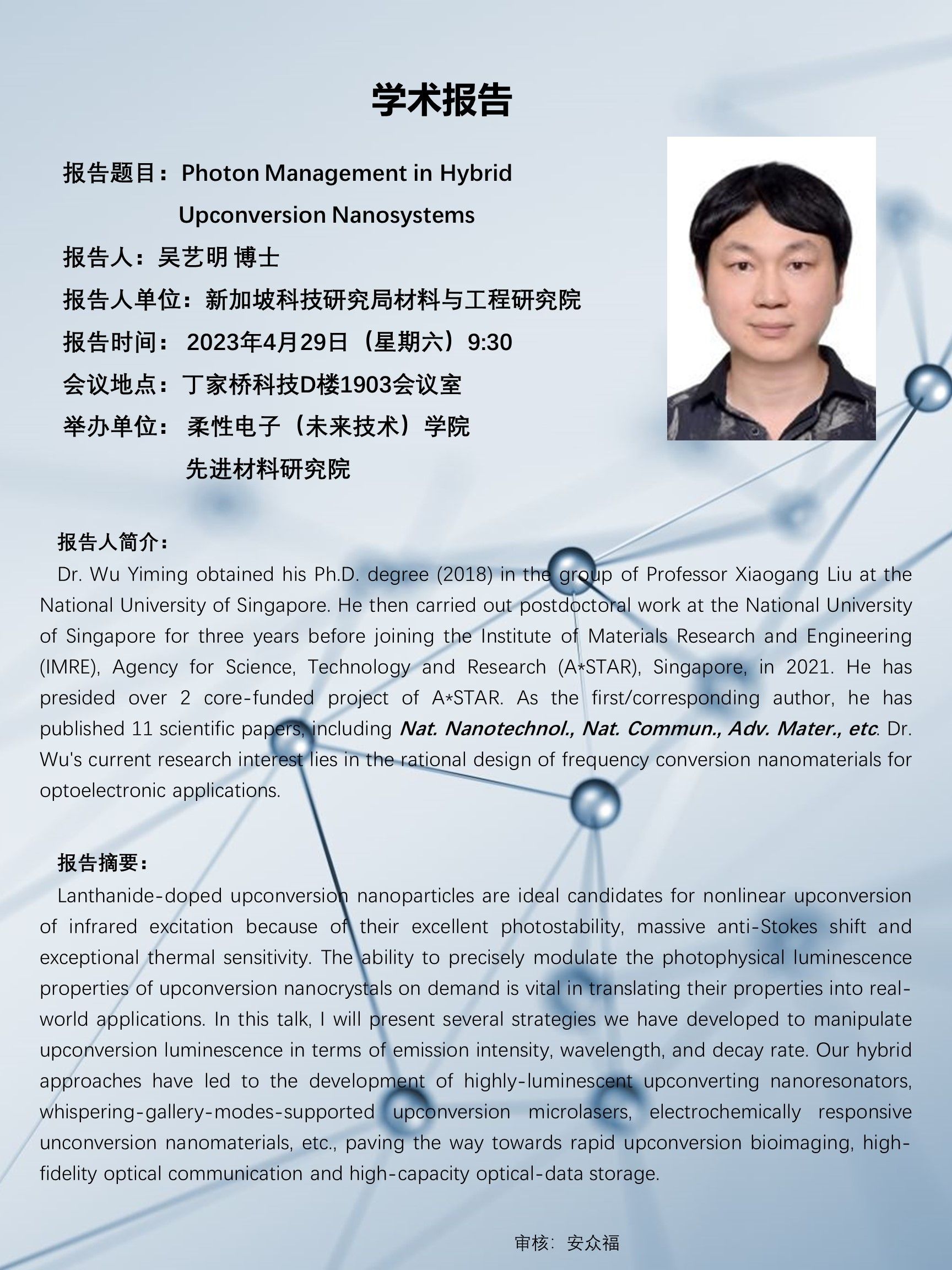 报告人简介:Dr. Wu Yiming obtained his Ph.D. degree (2018) in the group of Professor Xiaogang Liu at the National University of Singapore. He then carried out postdoctoral work at the National University of Singapore for three years before joining the Institute of Materials Research and Engineering (IMRE), Agency for Science, Technology and Research (A*STAR), Singapore, in 2021. He has presided over 2 core-funded project of A*STAR. As the first/corresponding author, he has published 11 scientific papers, includingNat. Nanotechnol., Nat. Commun., Adv. Mater., etc. Dr. Wu's current research interest lies in the rational design of frequency conversion nanomaterials for optoelectronic applications.