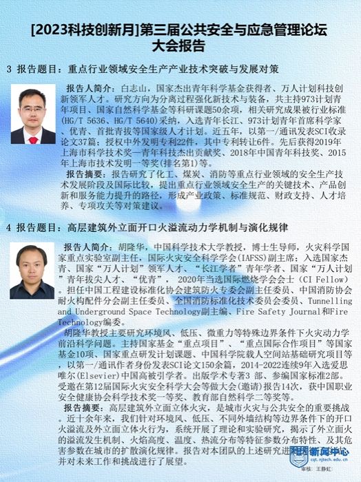 报告人简介:胡隆华,中国科学技术大学教授,博士生导师,火灾科学国家重点实验室副主任,国际火灾安全科学学会(IAFSS)副主席;入选国家杰青、国家级人才、“优青”,2020年当选国际燃烧学会会士(CI Fellow)。担任中国工程建设标准化协会建筑防火专委会副主任委员、中国消防协会耐火构配件分会副主任委员、全国消防标准化技术委员会委员、Tunnelling and Underground Space Technology副主编、Fire Safety Journal和Fire Technology编委。
